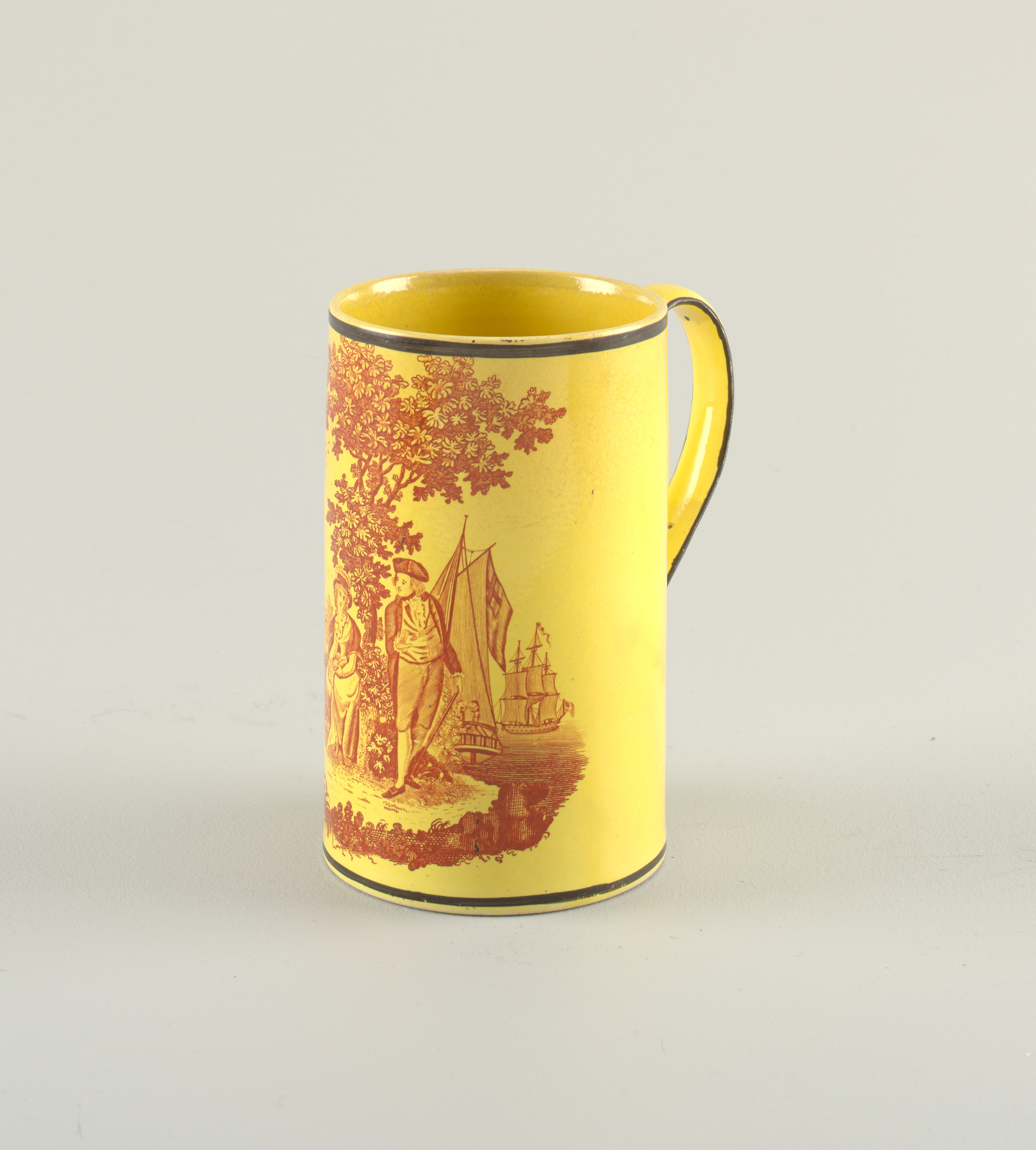 This mug is an example of yellow ground ware, which was produced by Spode and other English factories and exported to continental Europe starting in the late 18th century. The demand abroad inspired production in France, most notably at Creil, which lends its name to this type of work, as well as at Sèvres. The red transfer-printed decoration relates to prints of the day.