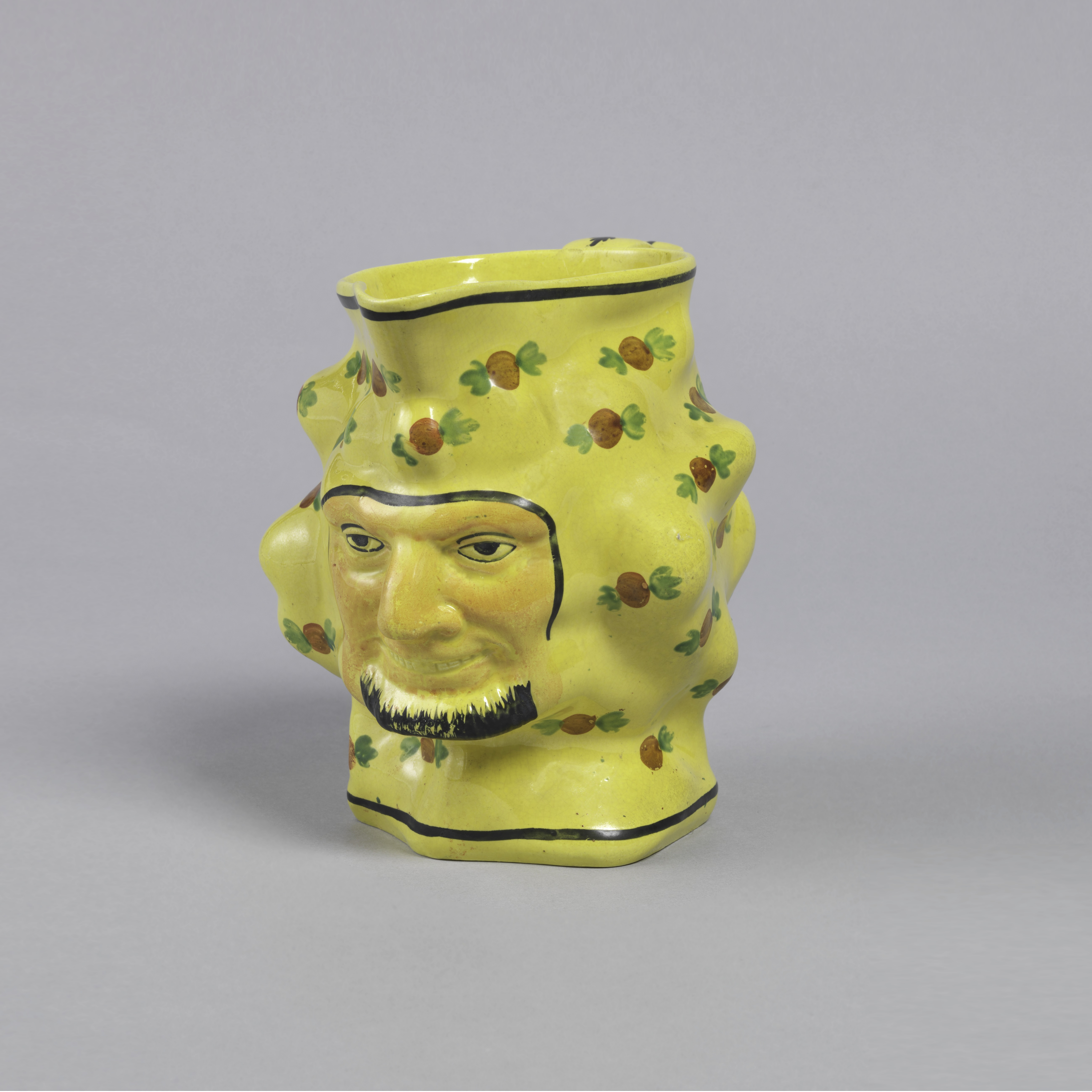 This jug is an example of yellow ground ware, which was produced by English factories and exported to continental Europe starting in the late 18th century. The demand abroad inspired production in France, most notably at Creil, which lends its name to this type of work, as well as at Sèvres.