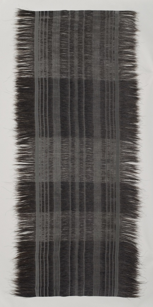 Horsehair, a material most commonly used for scratchy but durable 19th-century upholstery fabrics, is revitalized here in a simple structure that exploits the natural beauty of the material. The wide bands are formed by changes in density, which create translucent and opaque areas, and the unbound ends highlight the nature of the raw material.
