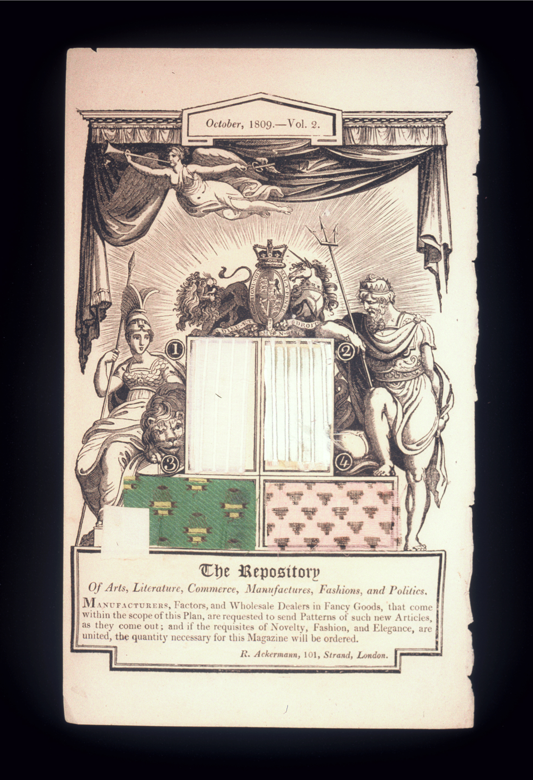 This is a Page from Ackermann's "Repository of the Arts, Science etc,". We acquired it in 1995. Its medium is d.) paper and textile swatches (fibers not identified). It is a part of the Textiles department.