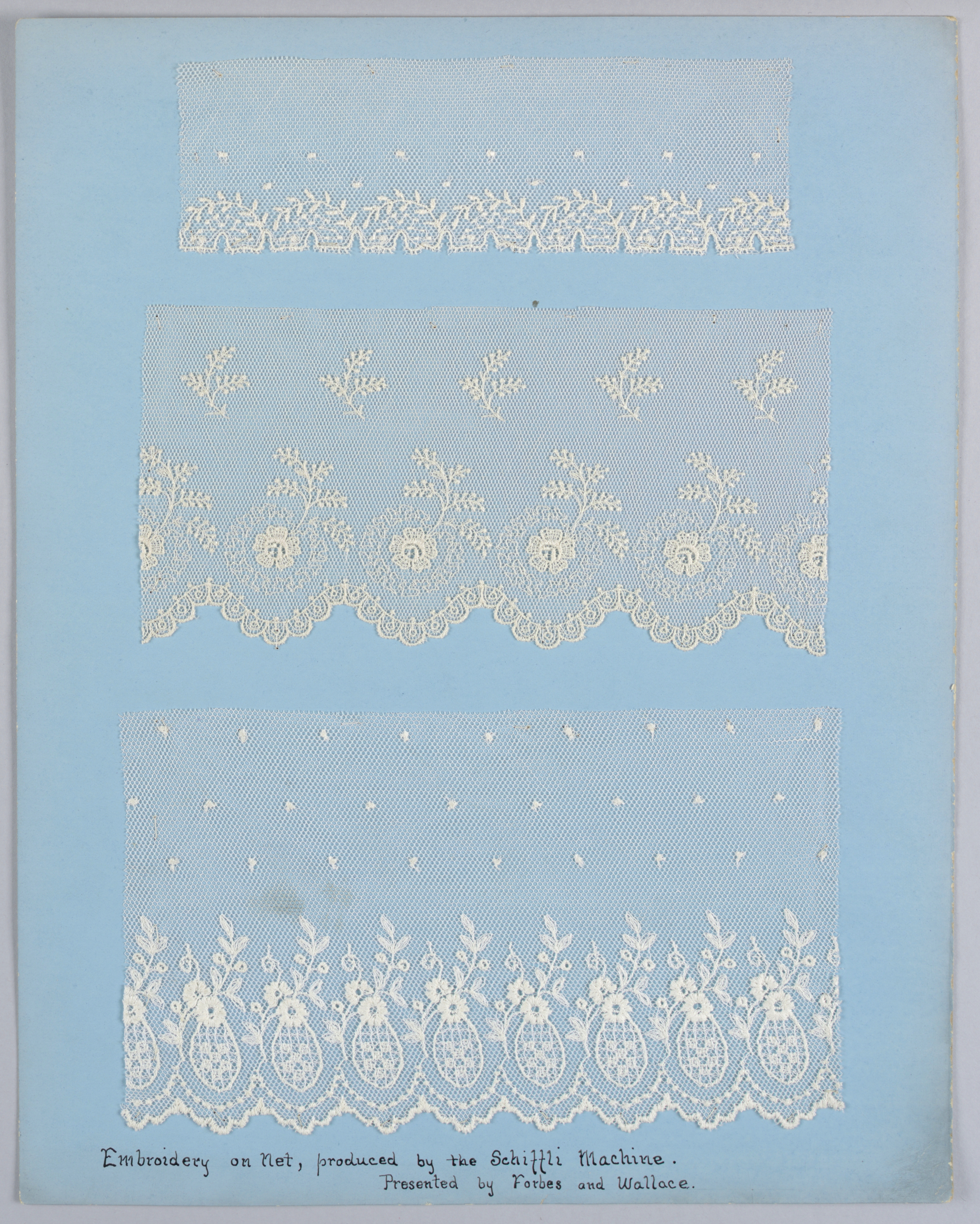 This is a Machine-made openwork samples. We acquired it in 1971. Its medium is cardboard, linen, silk, metallic and its technique is linen embroidery with ground cloth dissolved. It is a part of the Textiles department.