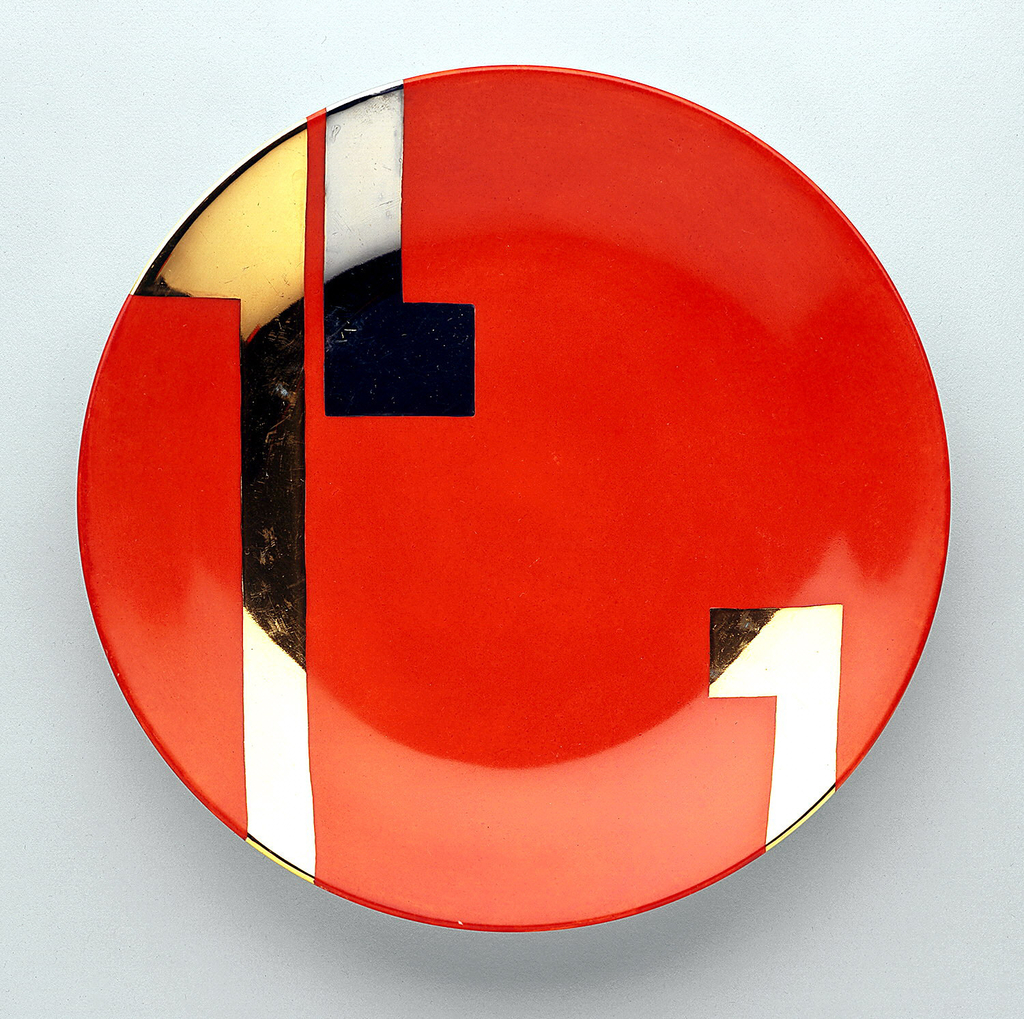 This is a plate. It was designed by Jean Luce and manufactured by Charles Ahrenfeldt and decorated by Charles Ahrenfeldt. It is dated ca. 1937 and we acquired it in 1969. Its medium is porcelain, vitreous enamel, gold, platinum. It is a part of the Product Design and Decorative Arts department.