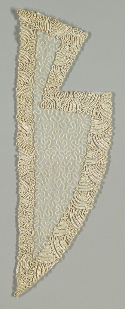 This is a Lapels. It was designed by Alberto Fasola and manufactured by Rialto Art Embroidery. It is dated ca. 1920–40 and we acquired it in 2007. Its technique is hand embroidered using couching and reverse chain stitches. It is a part of the Textiles department.