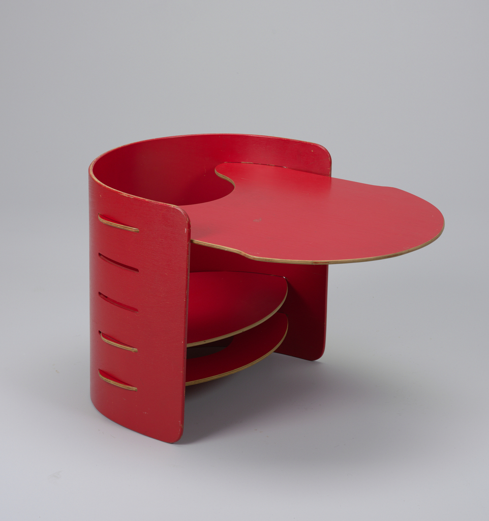 The chair under consideration is composed of a curved, slotted, laminated plywood shell into which a variety of planar components—seats, shelves, and table tops—can be inserted at different heights. Used individually or in combinations of up to four, it can be adjusted for growing children and configured into a variety of forms, such as a high chair, desk, or play station. This adaptable piece also appears as a telephone table in one period photograph, each slot holding a seat functioning as a shelf for a phone book. This simple, highly versatile form was Vedel’s first major design and was awarded the silver medal at the 1957 Milan Triennale.