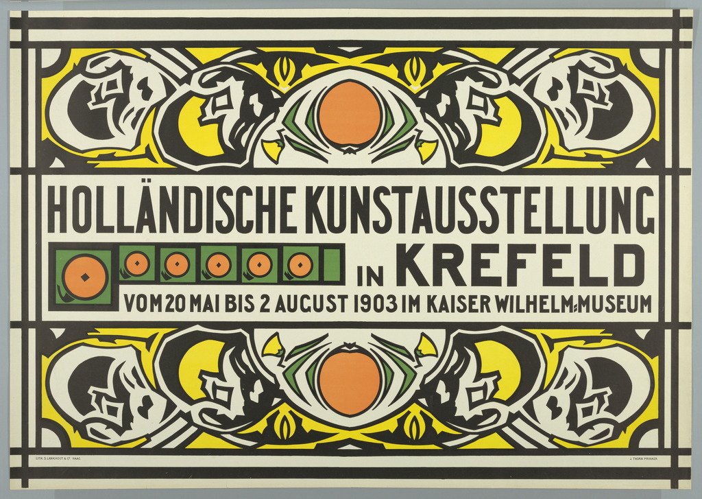 Poster, Holländische Kunstausstellung (Dutch Art Exhibition in Krefeld); Designed by Jan (Johan) Thorn-Prikker (Dutch, 1868 - 1932); Lithographer: S. Langhout & Co.; Netherlands; lithograph on white wove paper; 85.4 x 121.8 cm (33 5/8 x 47 15/16 in.); Museum purchase from the Members' Acquisitions Fund of Cooper-Hewitt, National Design Museum; 2008-4-1