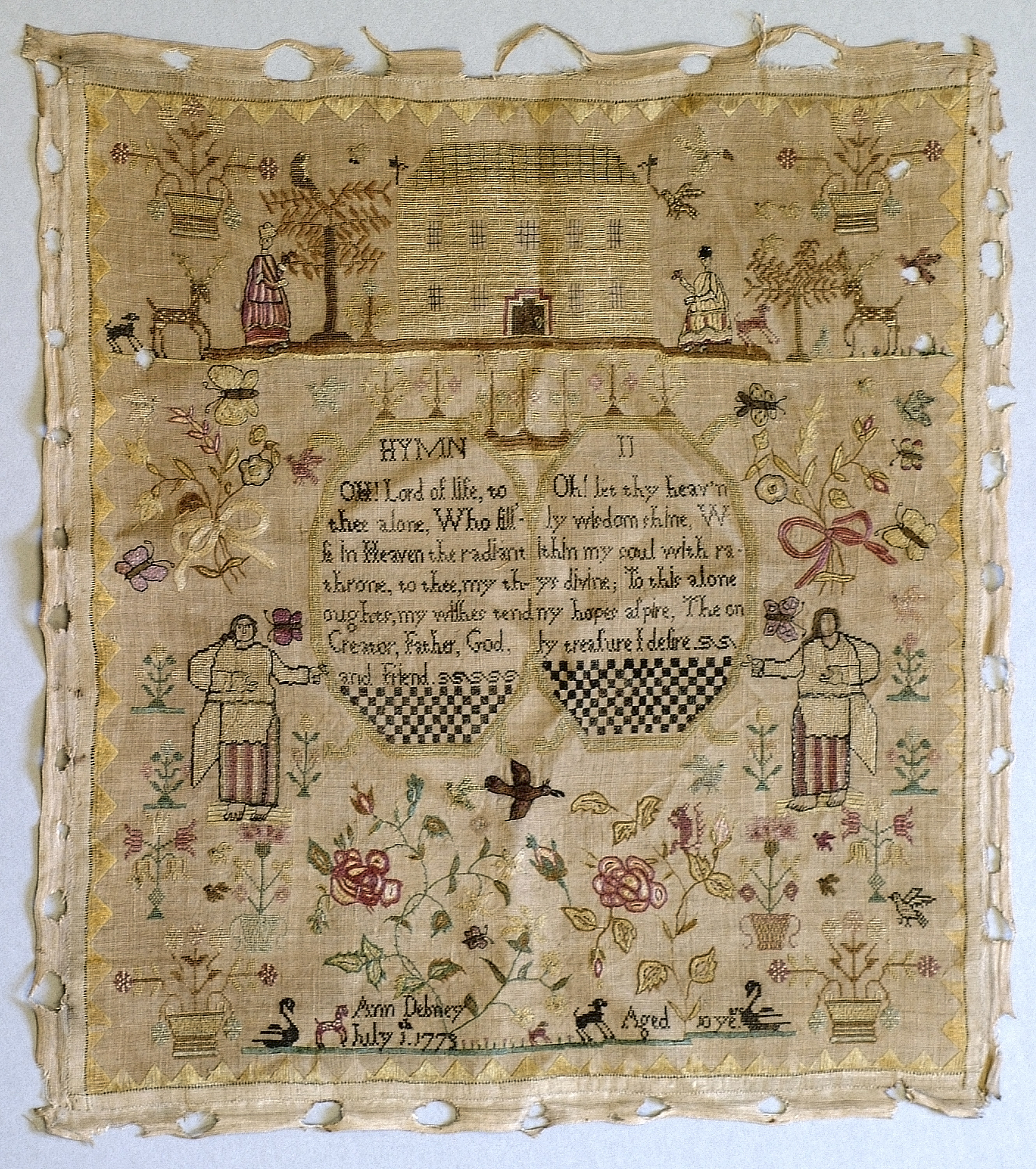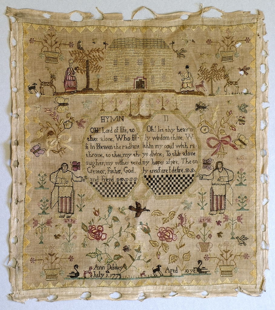 This is a Sampler. It was embroidered by Ann Debney. It is dated 1773 and we acquired it in 2008. Its medium is silk embroidery on linen foundation and its technique is cross-stitch embroidery on plain weave. It is a part of the Textiles department.