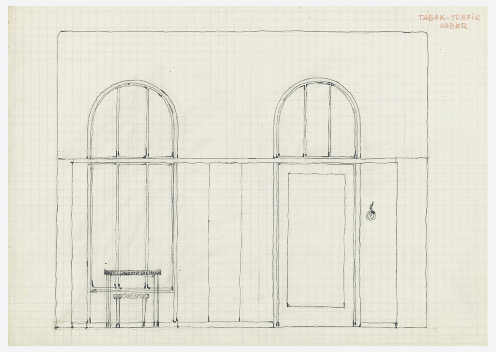 Drawing, Tabak-Trafik Naber [Tobaccanist's Shop (Wall Elevation with Window, Door, Table and Stool)]; Architect: Josef Hoffmann (Austrian, b. Moravia, 1870–1956); Austria; pen and dark gray ink, graphite, red pencil on graph paper; 21.1 x 29.7 cm (8 5/16 x 11 11/16 in.); Gift of Marilyn Walter Grounds; 2008-20-53