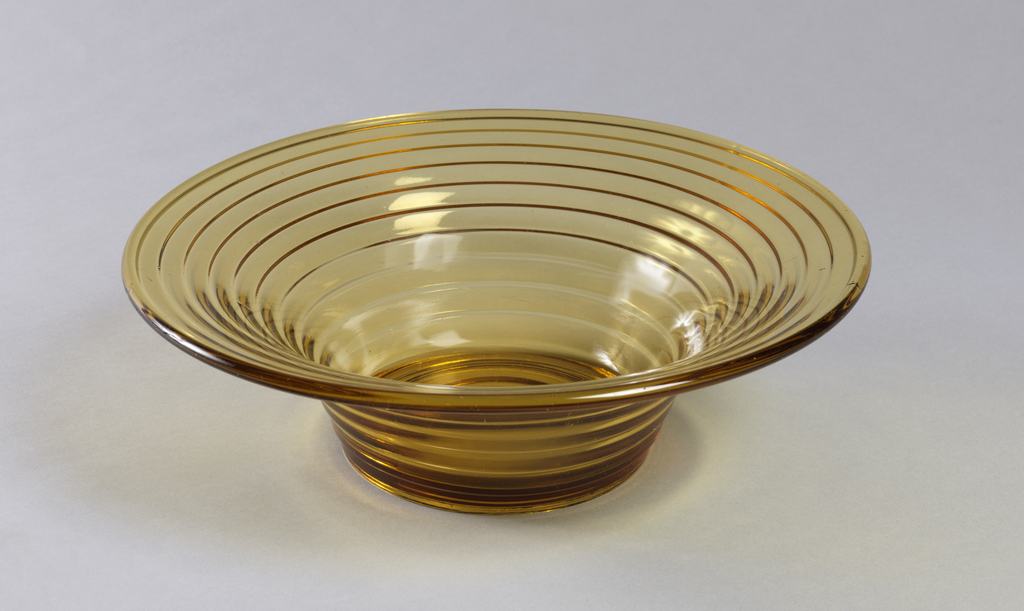 This bowl is part of the Bölgeblick series, which included a pitcher, tumbler, sugar bowl, creamer, plates, and large bowls. The concentric rings represent the ripples that appear on a body of water’s surface after a pebble has been thrown in. Aalto designed the series as her entry in Karhula-Iittala’s 1932 competition, which was held to promote modern design for art glass and utilitarian wares that were practical and affordable—concerns of particular social and economic consequence in the years following the Great Depression. Aalto’s pressed-glass Bölgeblick pieces were intended as standard everyday ware for the Finnish domestic market. Inexpensive and strong, the thick, stepped bodies were not only durable but also practical from a production standpoint as they were designed for standardized mass production using a mold; the simple circular forms with their horizontal ribs hid imperfections in the lower quality glass employed for such utilitarian goods. The series was available in clear, amber, blue, green, and smoky gray glass.