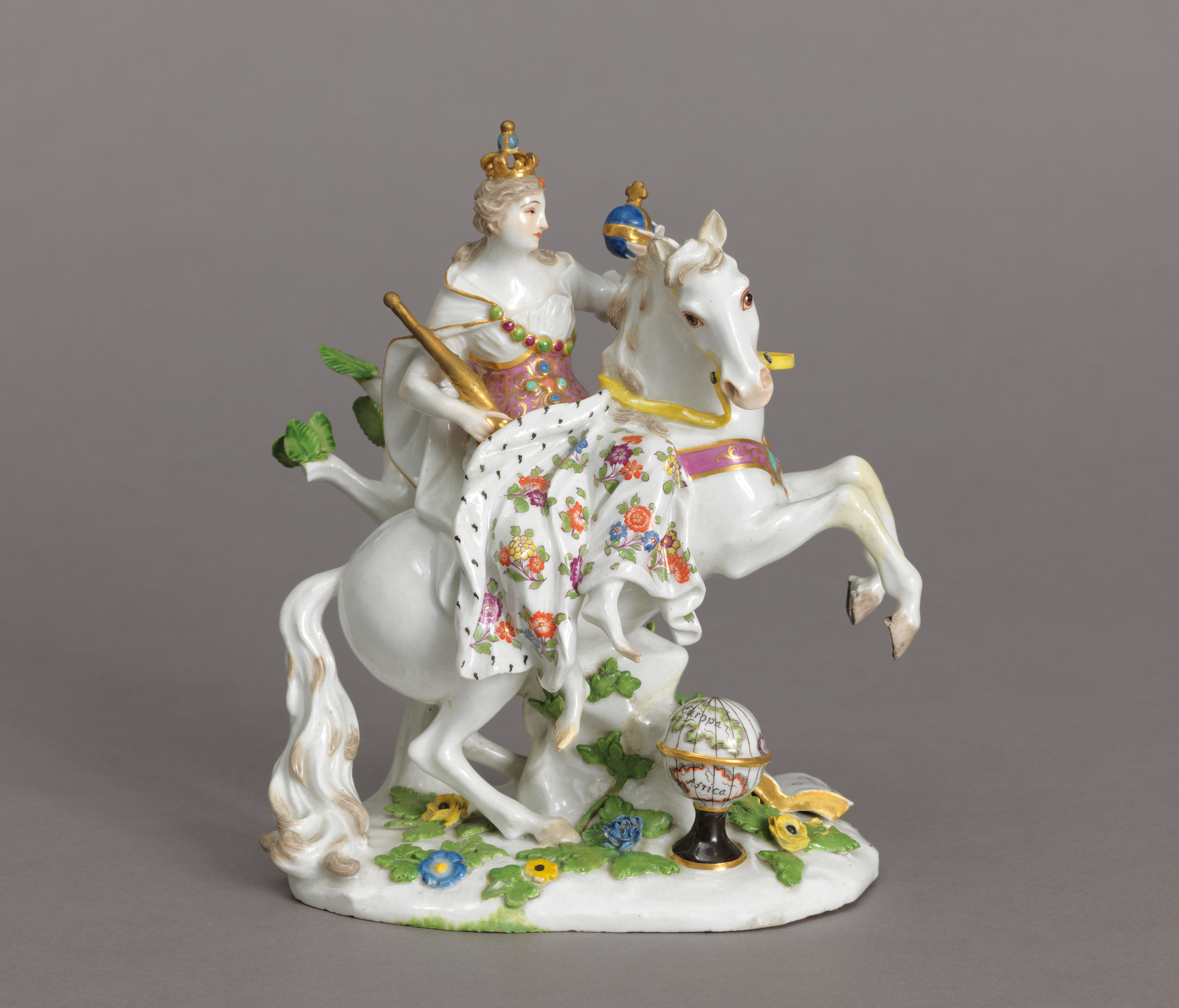 Allegorical Figure of "Europe" Figure; Manufactured by Meissen Porcelain Manufactory (Germany); Modeled by Peter Reinicke (German, 1715–1768), Johann Joachim Kändler (German, 1706–1775); After Gottfried Bernhard Götz (1708–1774); Germany; hard paste porcelain, vitreous enamel, gold; H x W x D: 11.3 × 17.5 × 13 cm (4 7/16 × 6 7/8 × 5 1/8 in.); Gift of the Estate of James Hazen Hyde; 1960-1-38-b