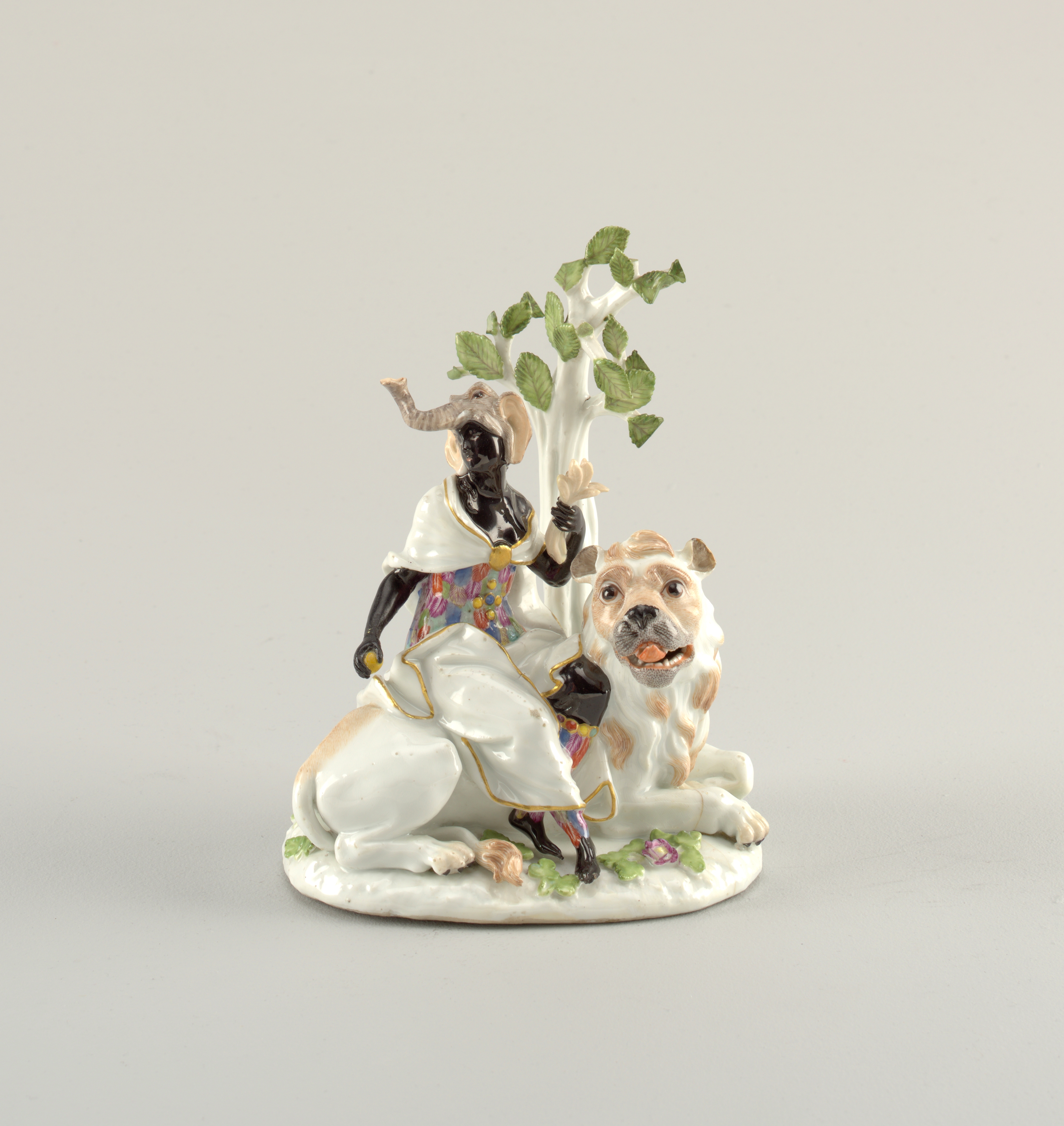 Allegorical Figure of "Africa" Figure; Manufactured by Meissen Porcelain Manufactory (Germany); Modeled by Peter Reinicke (German, 1715–1768), Johann Joachim Kändler (German, 1706–1775); After Gottfried Bernhard Götz (1708–1774); Germany; hard paste porcelain, vitreous enamel, gold; H x W x D: 19 x 14.8 x 10.5 cm (7 1/2 x 5 13/16 x 4 1/8 in.); Gift of the Estate of James Hazen Hyde; 1960-1-38-c