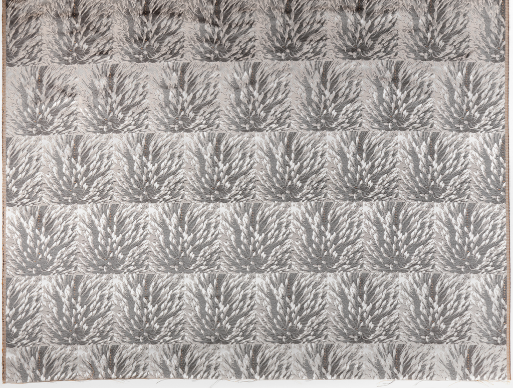 Silk Banksia was designed by Robertson while studying jacquard design and weaving at the renowned Fondazione Arte della Seta Lisio in Florence, Italy, in 2005. It was subsequently woven by the Bianchi Company in 2007 in Como, Italy. The Fondazione Lisio is dedicated to the preservation of Renaissance textile processes and offers classes and residencies for making silk jacquard, damask, brocade, and velvet on ancient looms. Silk Banksia relies on the extraordinary weaving traditions and expertise of the Fondazione Lisio. Few textile workshops or studios could replicate this unusually fine weaving, which comprises over 16,000 silk warp ends in a 150-cm width, achieving a density of 110 ends per centimeter. The ability to have such extraordinary quality ultimately led Robertson to work with a photographic detail of an image of banksias. The flower displays a vibrant movement of stamens and a high contrast of light and shadow. By reducing the number of colors to only five, she creates restraint without losing detail and gains a wonderful luminosity with the vivid orange that almost seems electrified.