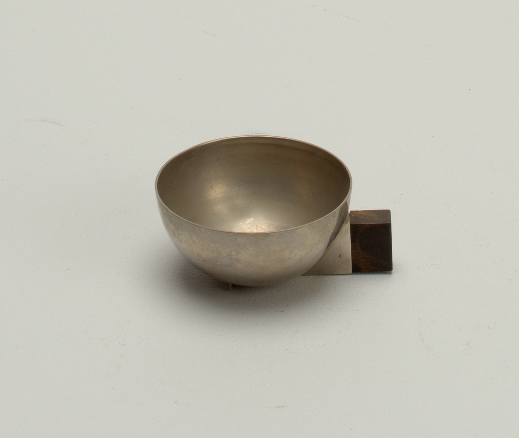 This is a cup. It is dated 1930–35 and we acquired it in 1967. Its medium is plated metal, wood. It is a part of the Product Design and Decorative Arts department.