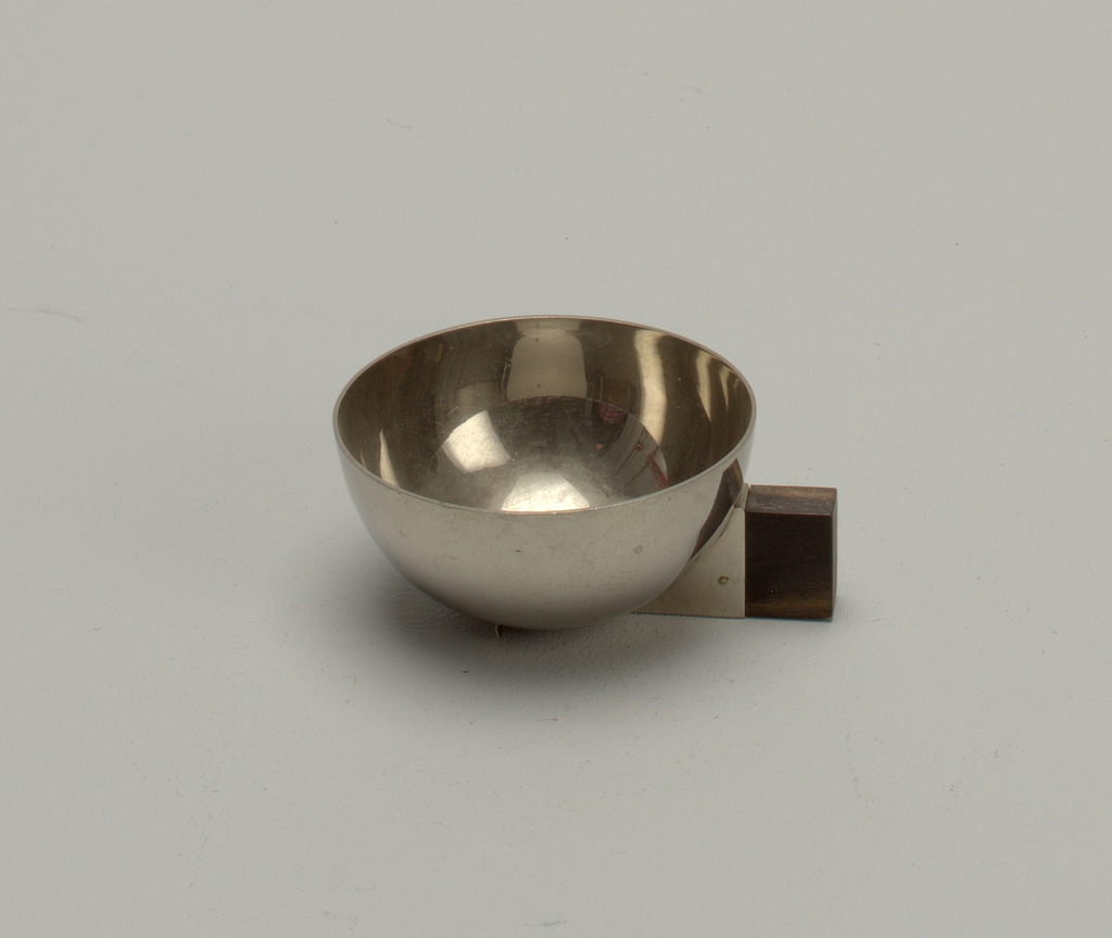 This is a cup. It is dated 1930–35 and we acquired it in 1967. Its medium is plated metal, wood. It is a part of the Product Design and Decorative Arts department.