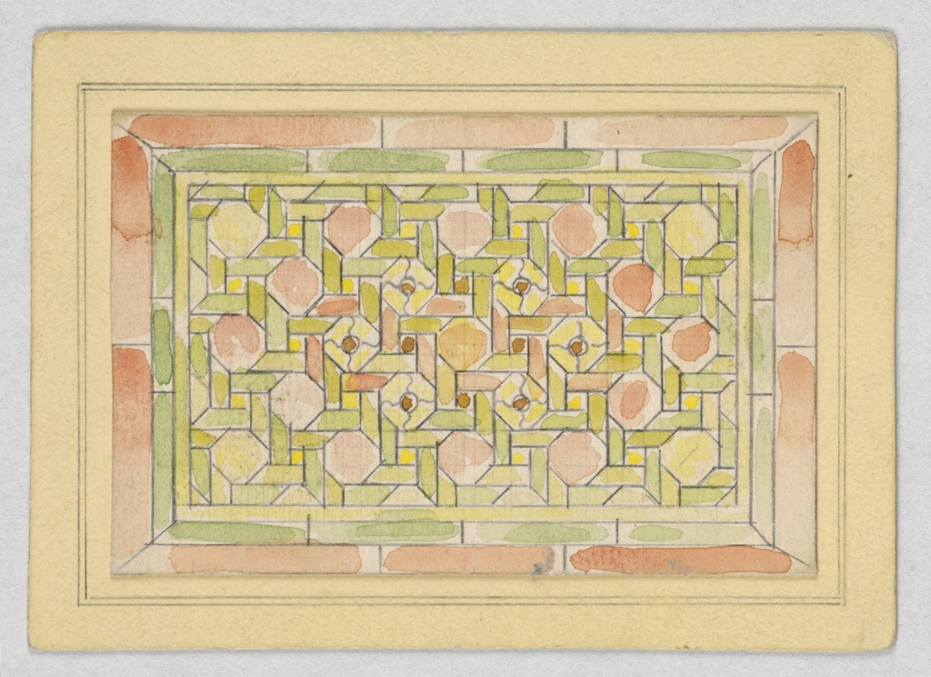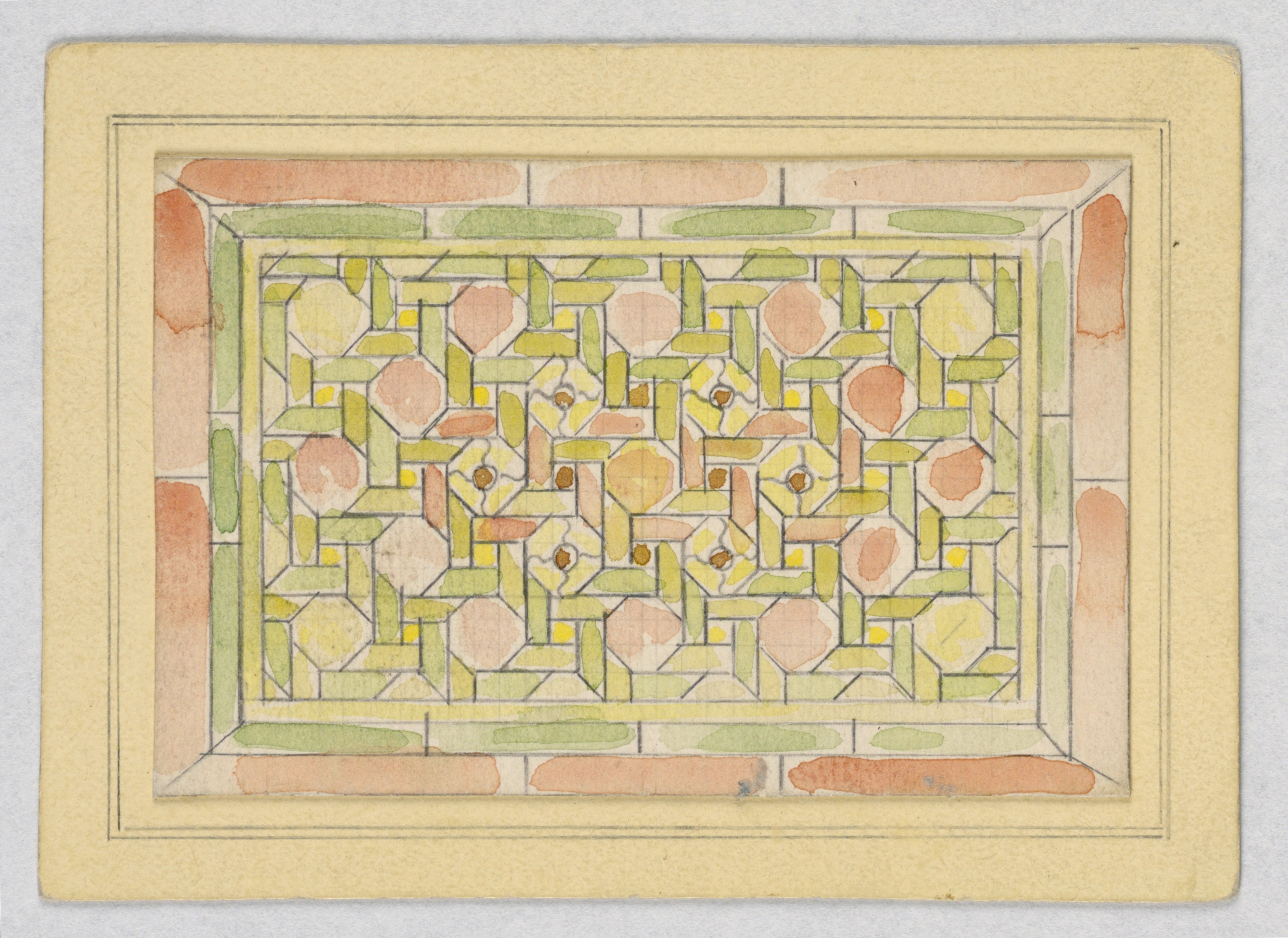 Drawing, Design for stained glass; Designed by Alice Cordelia Morse (American, 1863–1961); USA; brush and gouache, graphite on paper mounted on tan illustration board; Image: 5.7 x 8.2 cm (2 1/4 x 3 1/4 in.) Sheet: 7.2 x 10.2 cm (2 13/16 x 4 in.); Gift of Alice C. Morse; 2009-6-19