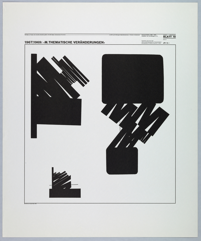 Printed in plate, top left margin: Beiträge zu Fragen der visuellen Gestaltung 23 CH 4001 Basle 1|Switzerland P.O.B.34 Printed in plate, top margin: ©1972 by W. Weingart. Basle|Switzerland Printed in Switzerland; Dokumentation 1960—1970./ Arbeiten von W. Weingart ICTA; Auflage: 75 Exemplare/ BLATT 10/ Serie 4/ sFr 3.— Printed in plate, near top [capitalized]: 1967|1969: <M.thematische Veränderungen> Printed in plate, beside above, in smaller type: Publiziert unter dem Titel <Schonwiedertypographie>. <Typographische/ Monatsblätter> St. Gallen, Nummer 11/1970. Printed in plate, lower left margin: 59 x 49 cm. Druck Mai 1972