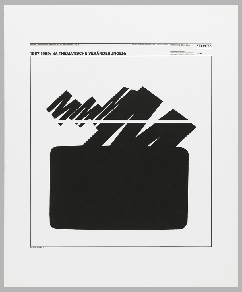 Printed in plate, top left margin: Beiträge zu Fragen der visuellen Gestaltung 26 CH 4001 Basle 1|Switzerland P.O.B.34 Printed in plate, top margin: ©1972 by W. Weingart. Basle|Switzerland Printed in Switzerland; Dokumentation 1960—1970./ Arbeiten von W. Weingart ICTA; Auflage: 90 Exemplare/ BLATT 13/ Serie 7/ sFr 3.— Printed in plate, near top [capitalized]: 1967|1969: <M.thematische Veränderungen> Printed in plate, beside above, in smaller type: Publiziert unter dem Titel <Schonwiedertypographie>. <Typographische/ Monatsblätter> St. Gallen, Nummer 11/1970. Printed in plate, lower left margin: 59 x 49 cm. Druck Mai 1972