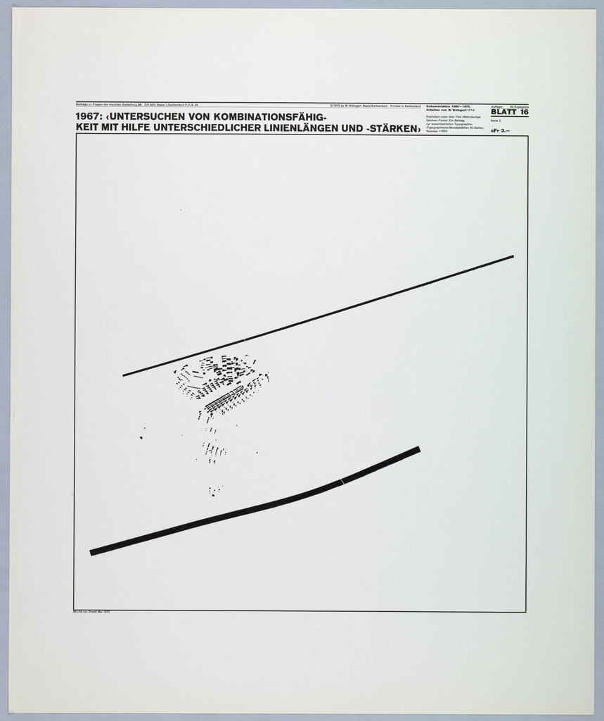 Printed in plate, top left margin: Beiträge zu Fragen der visuellen Gestaltung 29 CH 4001 Basle 1|Switzerland P.O.B.34 Printed in plate, top left margin: ©1972 by W. Weingart. Basle|Switzerland Printed in Switzerland; Dokumentation 1960—1970./ Arbeiten von W. Weingart ICTA; Auflage: 50 Exemplare/ BLATT 16 Printed in plate, near top [capitalized]: 1967: <Untersuchen von Kombinationsfähigkeit/ mit Hilfe unterschiedlicher Linienlänger und -stärken> Printed in plate, beside above, in smaller type: Publiziert unter dem Titel <Mehrdeutige Zeichen-Felder. Ein Beitrag zue experimentellen Typographie>./ <Typographische Monatsblätter> St. Gallen, Nummer 1/1970. Printed in plate, top right corner [beneath BLATT]: Serie 2/ sFR 3.— Printed in plate, lower left margin: 59 x 49 cm. Druck Mai 1972