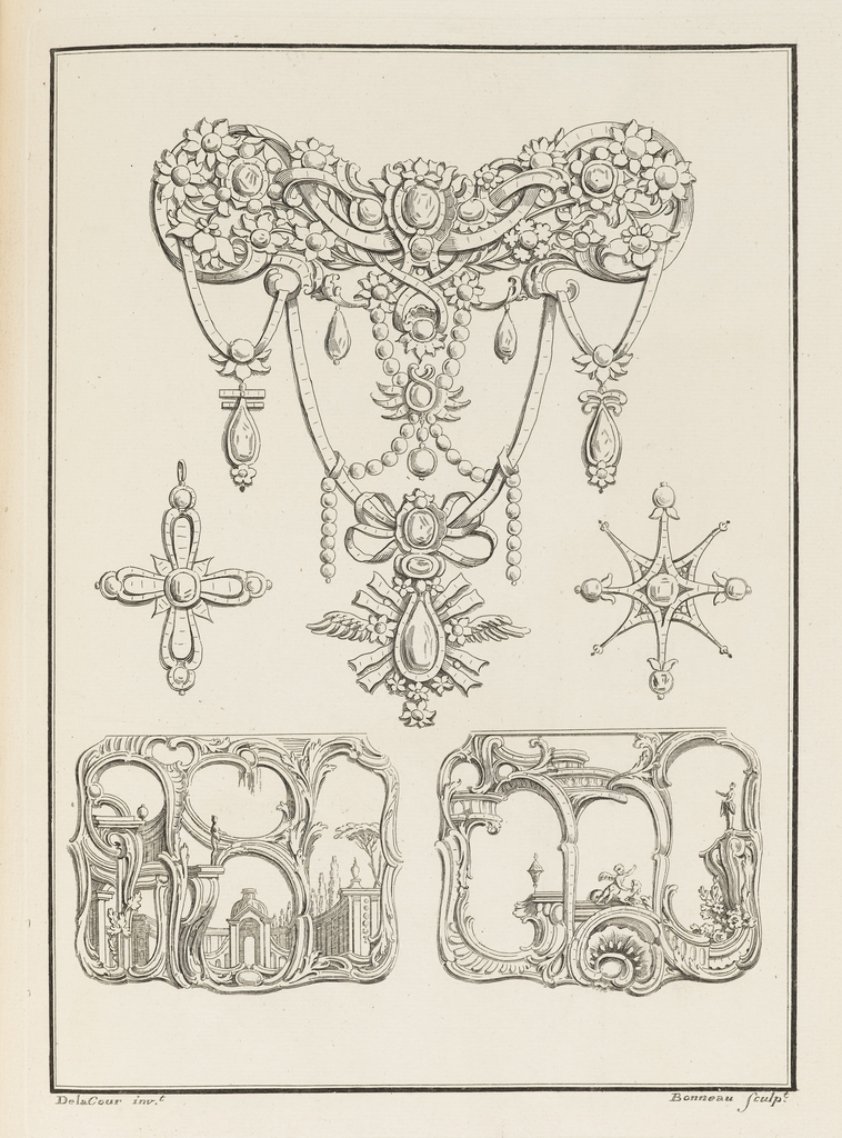 Bound Volume, Frontispiece for Book 4, in Eight books of Ornament; William Delacour (French, 1741 – 1767); Engraved by François Vivares (French, 1709 – 1782); France; engravings on white laid paper, bound in half-calf and marbled boards; Open: 41.4 x 48.1 x 11.7 cm (16 5/16 x 18 15/16 x 4 5/8 in.); Purchased for the Museum by the Advisory Council; 1962-126-1-45