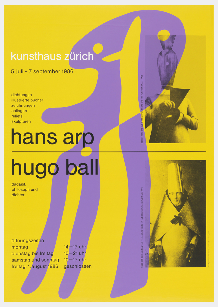 Poster, Hans Arp - Hugo Ball; Designed by Josef Müller-Brockmann (Swiss, 1914–1996); Switzerland; offset lithograph on wove paper; 128 x 90.6 cm (50 3/8 x 35 11/16 in.); Gift of Sara and Marc Benda; 2010-21-55