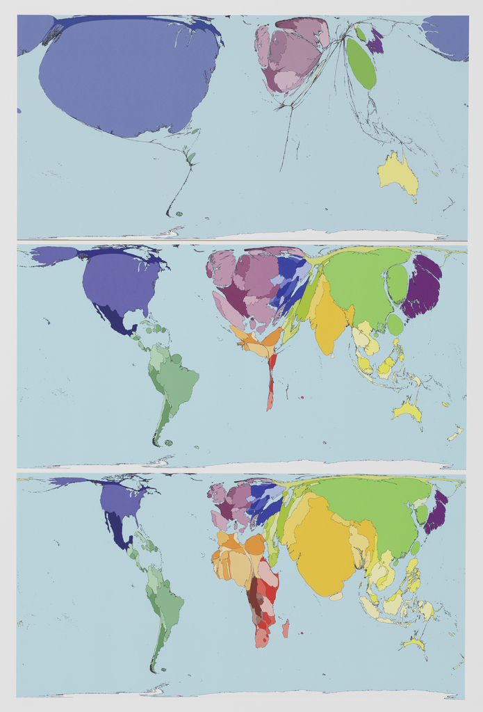 The field of information graphics has added a new dimension to contemporary graphic design. The Worldmapper project, which was featured in the museum’s 2010 National Design Triennial, Why Design Now?, enables an expansive mapping system. It was invented by a group of geographers from the Social and Spatial Inequalities Research Group at the University of Sheffield, England (Dan Dorling, Graham Allsopp, Anna Barford, Benjamin Wheeler, and John Pritchard), with the assistance of Mark Newman, a physicist from the University of Michigan. The Worldmapper system is able to convert statistical information into an easy to understand colored map (known as a cartogram or a density equalizing map) in which countries change their size and shape according to the variable being measured. More than 400 different maps have been created at the time of proposed acquisition.