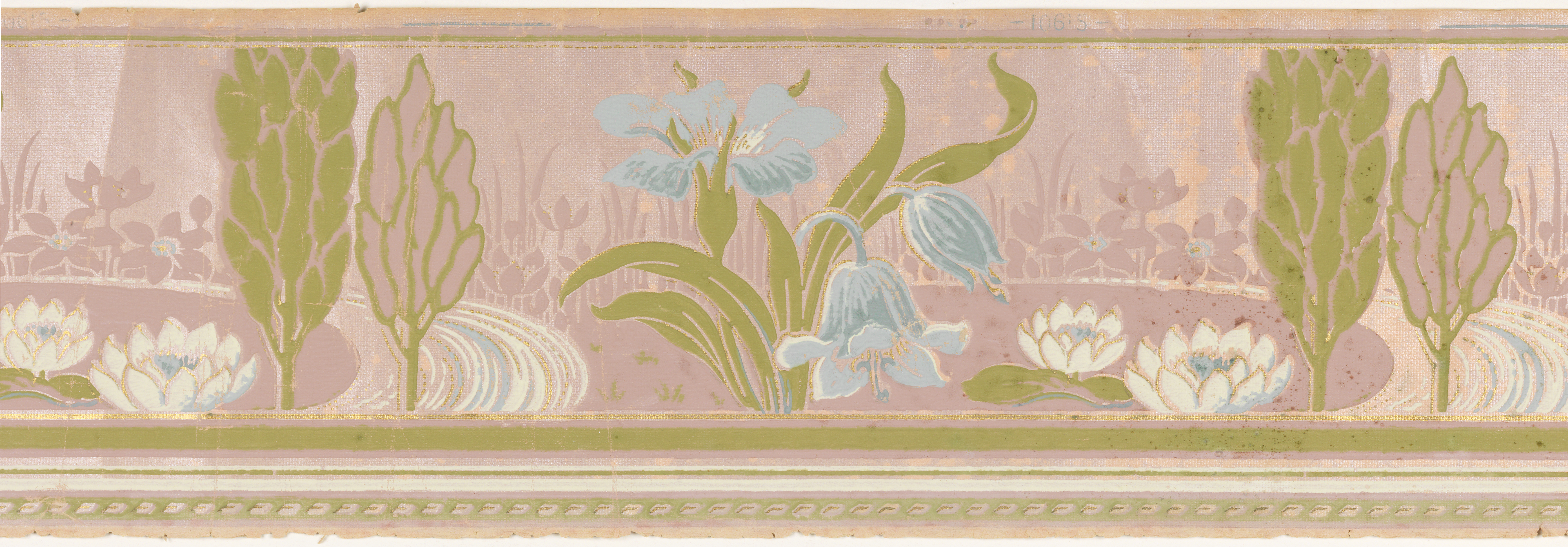 Most wallpapers designed with a water theme were intended for use in bathrooms. Given the early date of this Art nouveau border with its pond and water lilies it was possibly intended to partner with a similarly-styled wallpaper in a bedroom. Most wallpapers for the bathroom designed before 1910 appeared more hygienic due to sanitary concerns and usually had a varnished surface to resist water and facilitate washing. This border imagery creates a calm and peaceful scene with trees and flowers surrounding a tranquil pond. The selection of colors including lavender, blue, and green enhance this ambience. There is also what appears to be a road, with a circular perfection, or possibly a manicured sandy shore. The lavender color used in the sky portion has been infused with mica powder which adds a little sparkle or metallic effect.
