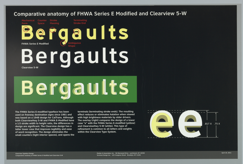 Poster, Comparative Anatomy of FHWA Series E-modified to Clearview 5-W; Printed by Meeker & Associates; USA; color inkjet print with epson ultrachromek3 ink on epson proofing paper commercial; 60.8 x 91.5 cm (23 15/16 in. x 36 in.); Gift of Donald Meeker, Meeker & Associates, Inc., and James Montalbano, Terminal Design, Inc.; 2011-24-1