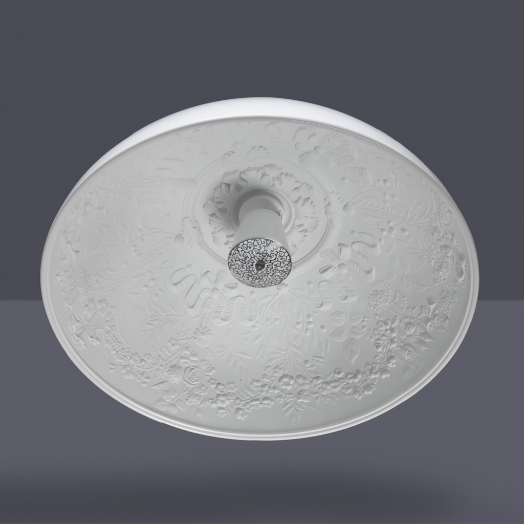 The lamp is a large white dome, the interior of which is lined with a plaster hemisphere with relief decoration of delicate foliate and floral swags bathed in light from a central source. Standing under the bright niche-like dome with its floral imagery, one can delight in its lyrical and decorative qualities. It is a clever contemporary reference to a decorative ceiling motif popular in earlier decorative arts.