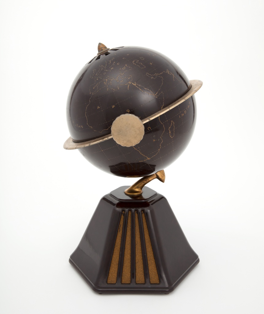 The globe-shaped radio depicts the seven continents, but omits individual country names. It was available in three different color combinations: black and gold, maroon and gold, and ivory and gold. The ivory and gold option was considered the “top of the line.” The radio’s speaker was located in the base; the metal ring played a dual role—one as the decorative indication of the earth’s equator and the other as the functional connector of the two metal knobs that controlled the power, volume, and station tuning. Advertisements deemed the radio “the ultimate in design.” The New World radio was a commercial success despite its high price point of $60 during the Great Depression. By using a globe’s shape and decoration, Loewy linked listening to the radio with the modern notion of connecting to the world. The radio’s form also alludes to the globe as a decorative motif in historical decorative arts, such as Renaissance automata like celestial globes with clockwork.
