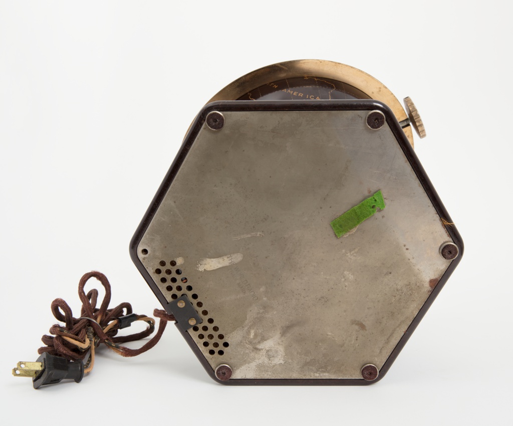 The globe-shaped radio depicts the seven continents, but omits individual country names. It was available in three different color combinations: black and gold, maroon and gold, and ivory and gold. The ivory and gold option was considered the “top of the line.” The radio’s speaker was located in the base; the metal ring played a dual role—one as the decorative indication of the earth’s equator and the other as the functional connector of the two metal knobs that controlled the power, volume, and station tuning. Advertisements deemed the radio “the ultimate in design.” The New World radio was a commercial success despite its high price point of $60 during the Great Depression. By using a globe’s shape and decoration, Loewy linked listening to the radio with the modern notion of connecting to the world. The radio’s form also alludes to the globe as a decorative motif in historical decorative arts, such as Renaissance automata like celestial globes with clockwork.