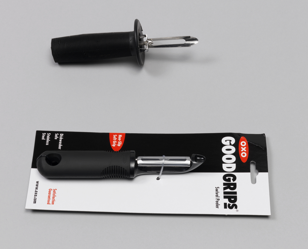 Good Grips Peeler In Packaging; Designed by Davin Stowell (American, b. 1953), Daniel Formosa (American, b. 1953); Manufactured by OXO International (United States); Design Team Member: Tucker Viemeister (American, b. 1948); Firm: Smart Design, Inc. (United States); USA; molded thermoplastic rubber (santoprene), polypropylene, stainless steel; paper, plastic (packaging); H x W (packaging): 26.7 x 10.6 cm (10 1/2 x 4 3/16 in.); Gift of Smart Design, Inc.; 2011-50-21