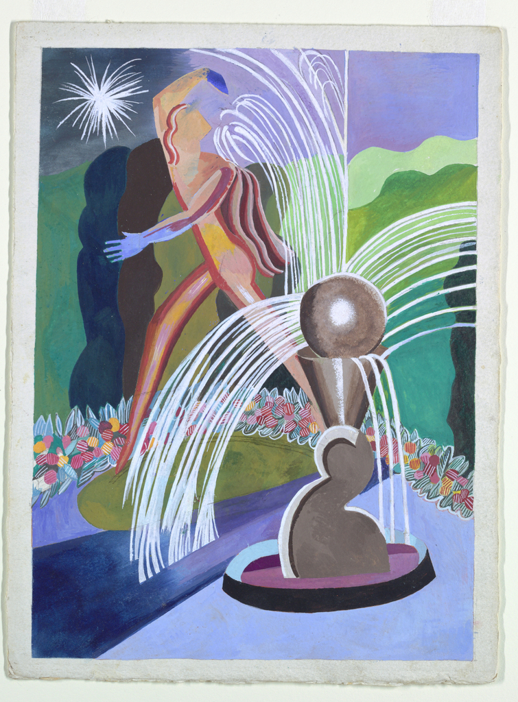 Drawing, Decorative Composition with Nude in Fountain Landscape; Designed by Alexandra Exter (Ukrainian, 1882–1949); Russia; brush and gouache, graphite on heavy, textured white board; 38.7 x 29.0 cm (15 1/4 x 11 7/16 in. ), sheet 35.9 x 26.0 cm (14 3/16 x 10 1/4 in.), image; Bequest of Simon Lissim; 1981-37-14