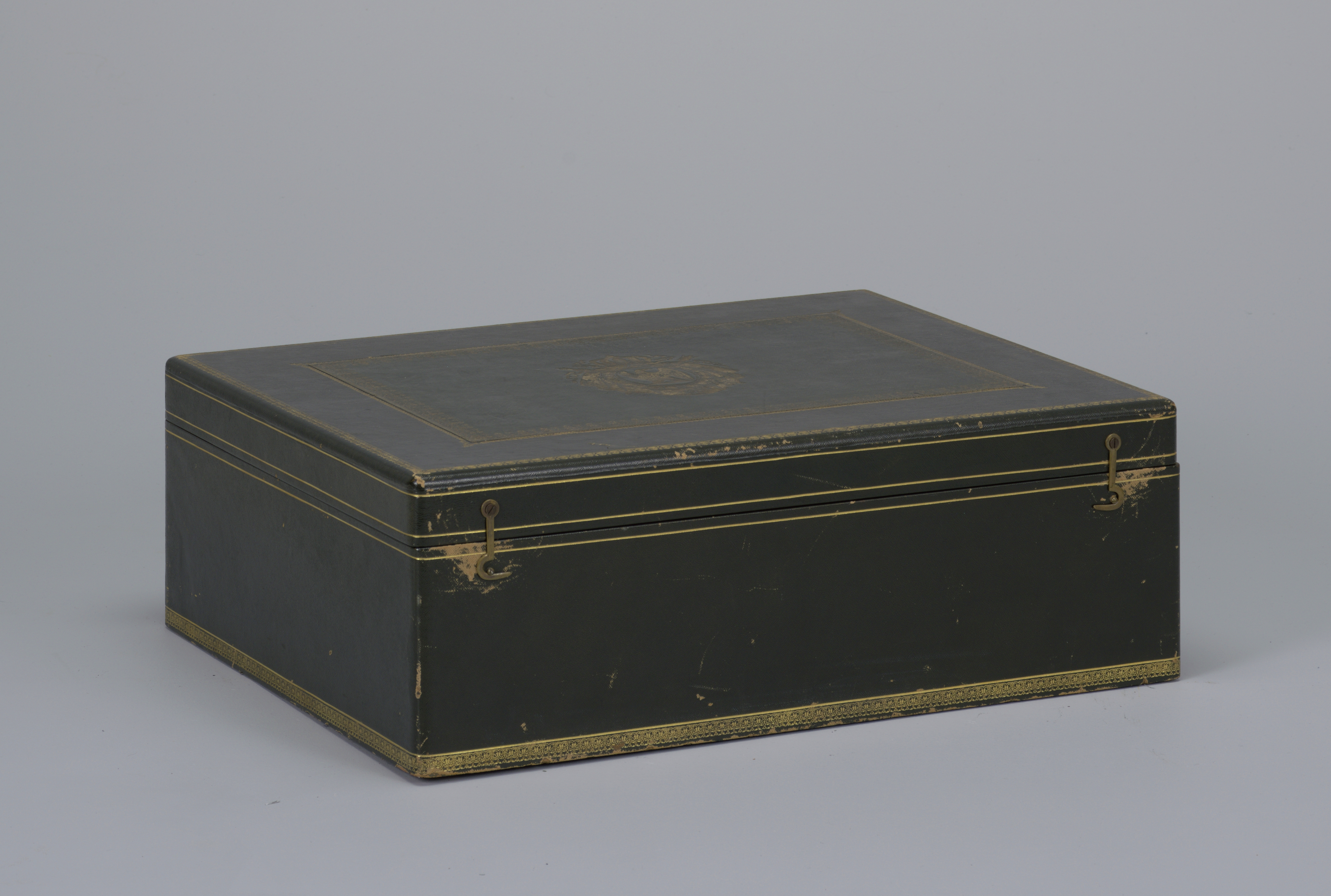 Leather Case, from a Sèvres Breakfast Service (Déjeuner Mosaïque Florentine) Case; probably France; leather, wood, fabric, metal; H x W x D: 18.5 x 55.5 x 44.5cm (7 5/16 x 21 7/8 x 17 1/2in.); Gift of Katrina H. Becker in memory of her parents, Mr. and Mrs. Charles V. Hickox; 1981-38-9-a,b