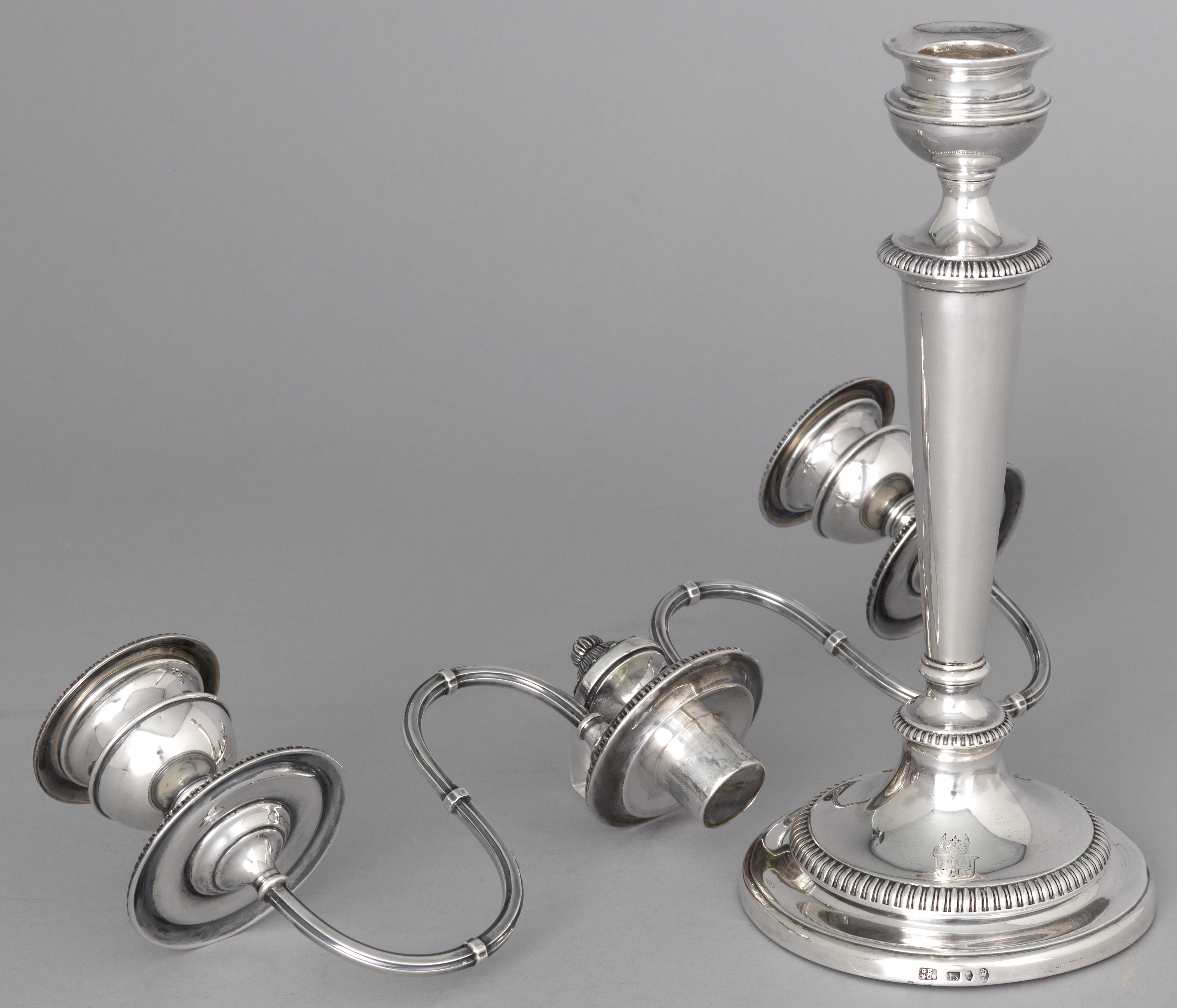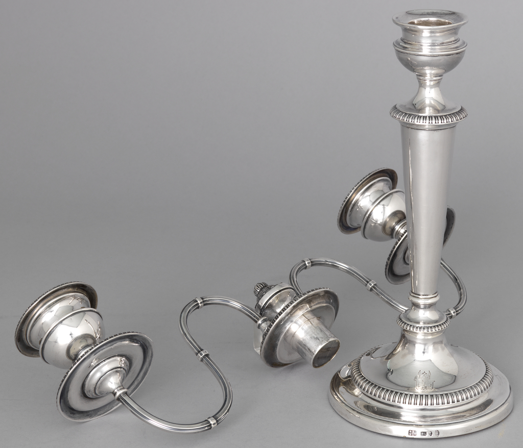 On edge of base (a): [1] “GE / & Co.”, impressed (maker’s mark) [2] Crown over “L”, impressed (town mark, Sheffield; date mark, 1810) [3] Head of King George III, impressed (duty mark, 1786–1821) [4] Lion passant, impressed (standard mark, England) [5} 23 = 4 , incised On central neck of candelabra arms (b); [1] “GE / & Co.”, impressed (maker’s mark) [2] Crown over “X”, impressed (town mark, Sheffield; date mark, 1817) [3] Head of King George III, impressed (duty mark, 1786–1821) [4] Lion passant, impressed (standard mark, England) On neck of bobeche (c): [1] “GE / & Co.”, impressed (maker’s mark) [2] Crown over “X”, impressed (town mark, Sheffield; date mark, 1817) [3] Head of King George III, impressed (duty mark, 1786–1821) [4] Lion passant, impressed (standard mark, England) On neck of bobeche (d): [1] “GE / & Co.”, impressed (maker’s mark) [2] Crown over “X”, impressed (town mark, Sheffield; date mark, 1817) [3] Head of King George III, impressed (duty mark, 1786–1821) [4] Lion passant, impressed (standard mark, England)