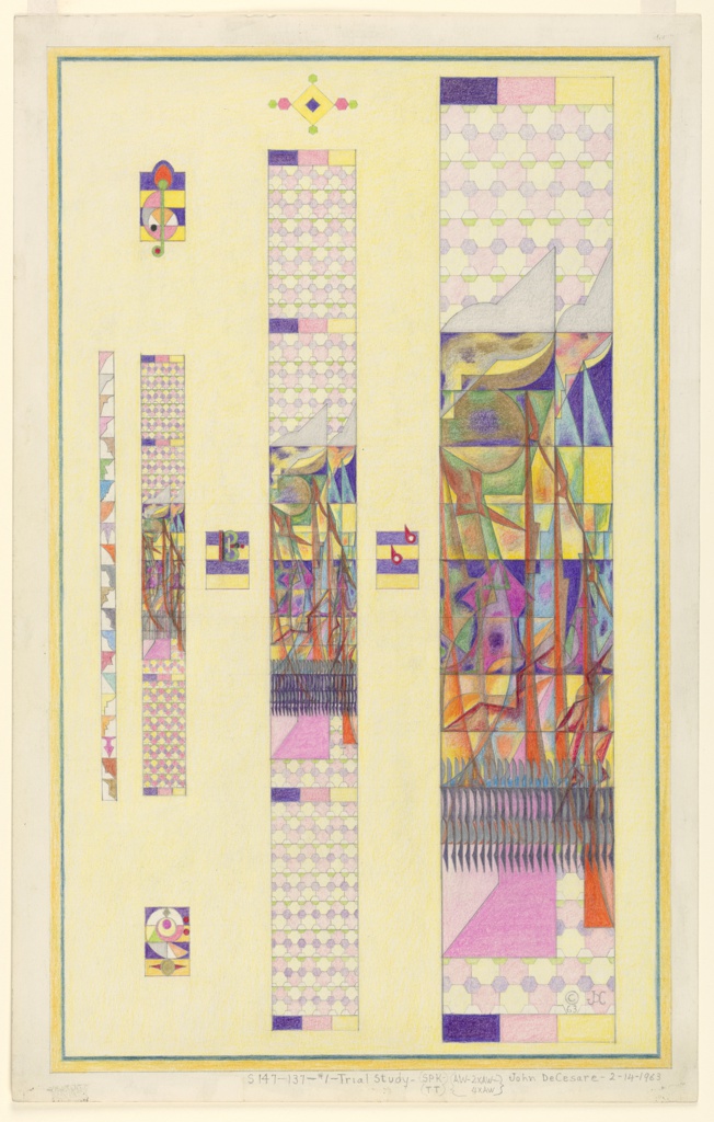 By the mid-1940s the International Style in architecture was rapidly making traditional architectural decoration either functionally untenable or aesthetically undesirable, and John De Cesare retired. He did not, however, retire to lament the passing of an architectural era or his own sculptural career. Instead, he began to evolve an intricate and complex theory using the medium of colored pencil drawings. It was his belief that the sounds of music could be made visual. He was well prepared through his formal training and professional career to demonstrate his theories pictorially, as he had extraordinary skills as a draftsman and model maker and produced remarkably beautiful, refined drawings.