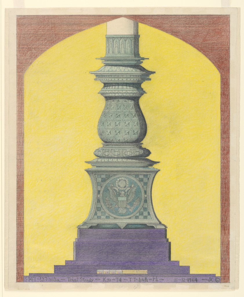 This is a Drawing. It was designed by John De Cesare. It is dated October 12, 1964 and we acquired it in 1982. Its medium is color pencil, graphite on cream wove paper. It is a part of the Drawings, Prints, and Graphic Design department.