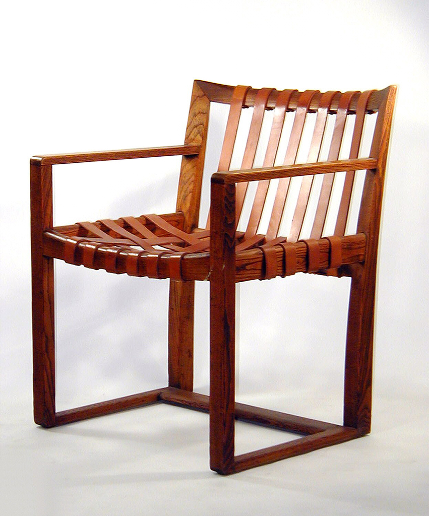 This is a Armchair. It is dated ca. 1930 and we acquired it in 1982. Its medium is wood, leather. It is a part of the Product Design and Decorative Arts department.