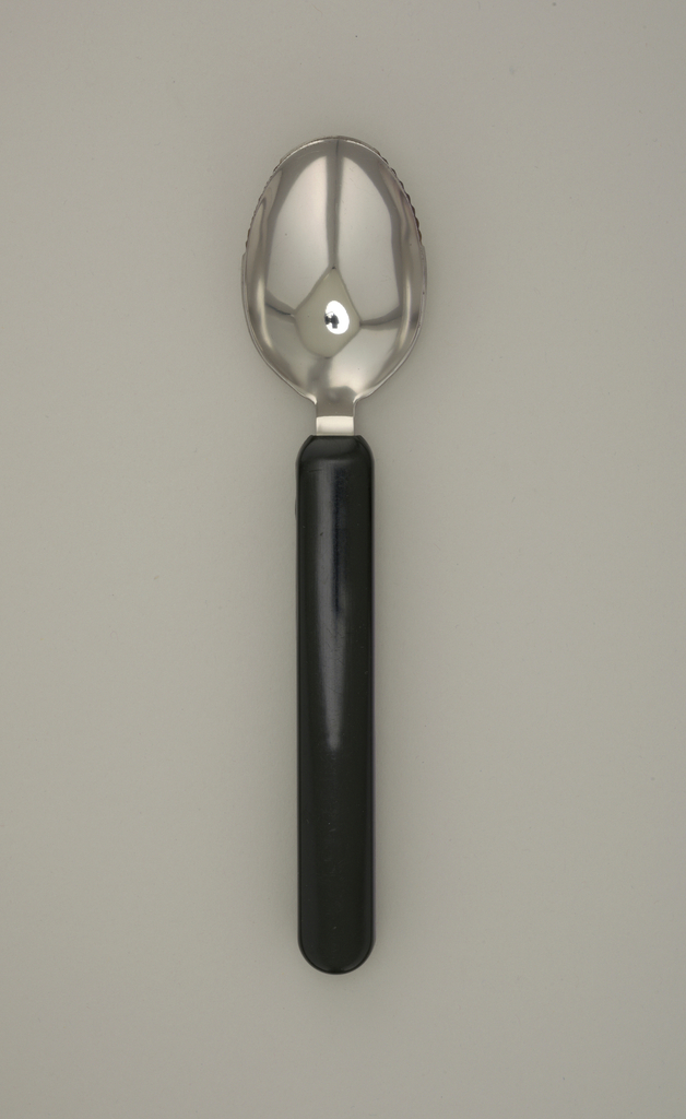 This is a Knife / spoon. It was designed by Ergonomi Design Gruppen and design team member: Maria Benktzon and Sven-Eric Juhlin and manufactured by RFSU Rehab. It is dated 1981 and we acquired it in 1982. Its medium is stainless steel, plastic (melamine, polycarbonate). It is a part of the Product Design and Decorative Arts department.