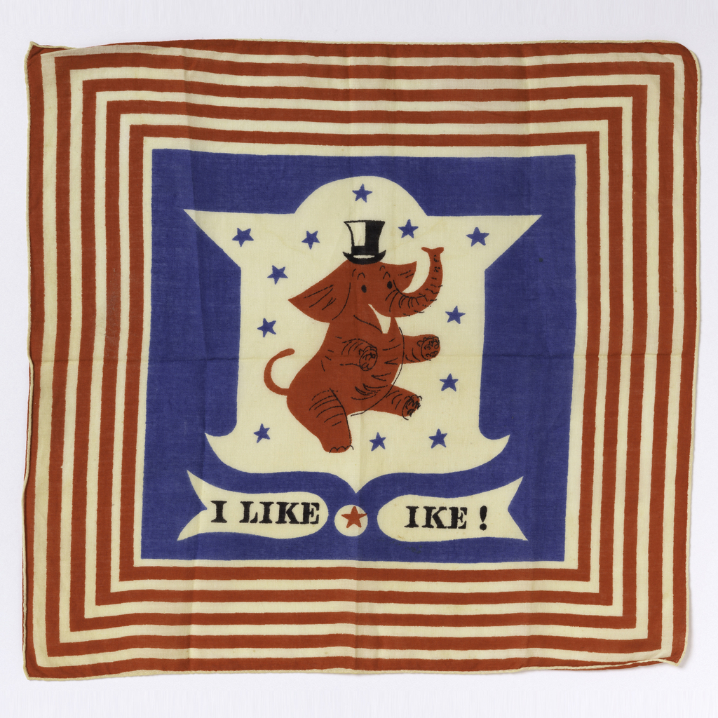 Tammis Keefe (American, 1913-1960) was an influential mid-century textile designer best known for her playful designs, often printed with humorous slogans. One dishtowel in the museum collection features fire engines and the words, “Something’s Burning!,” (1982-79-6) and another, owls and the words “whoooos for dinner” (1982-79-12). Keefe designed this handkerchief with the slogan “I like Ike!” for Dwight Eisenhower’s presidential campaign in 1952. Like printed T-shirts and bumper stickers used in political campaigns today, cheaply-printed handkerchiefs were important campaign tools in the early twentieth century. By 1952, when this example was made, the ‘golden age’ of handkerchiefs had waned and most people used paper tissues. This example might therefore have been intended to appeal to an older generation of voters.