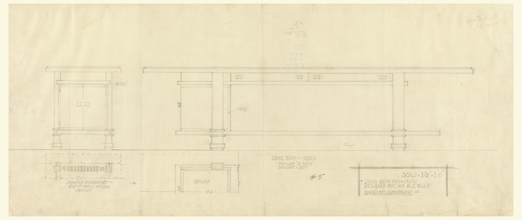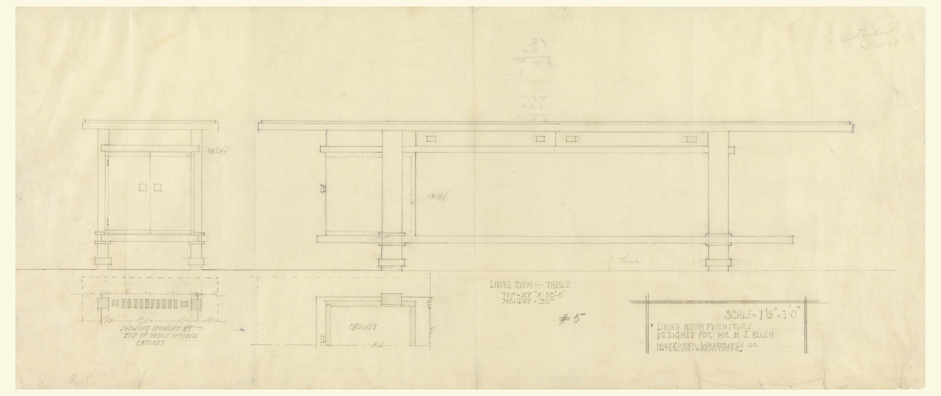 Inscribed in graphite, center: LIVING ROOM TABLE/ TOP - 27" X 10" 0"/ HEIGHT 30" (all underlined); in ruled border: LIVING ROOM FURNITURE/ DESIGNED FOR MR. H.J. ALLEN/ NIEDECKEN-WALBRIDGE CO./ INTERIOR ARCHITECTS (all underlined); in graphite on design: INLAY/ INLAY/ SHOWING SPINDLES AT/ END OF TABLE OPPOSITE/ CABINET/ CABINET/ 1 of these/ #5 (all underlined); upper right: detailed/ Nov. 17 '17 (all underlined)