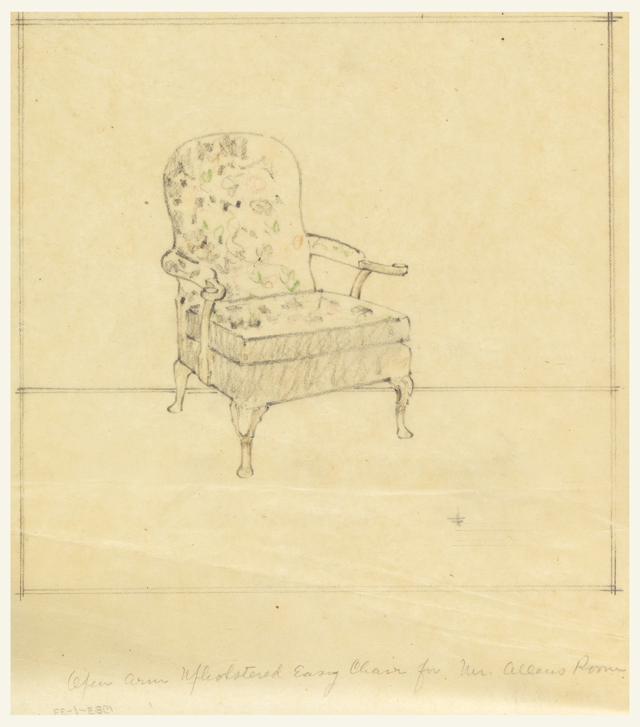 Inscribed in graphite, across bottom: Open Arm Upholstered Easy Chair for Mr. Allens Room (all underlined).