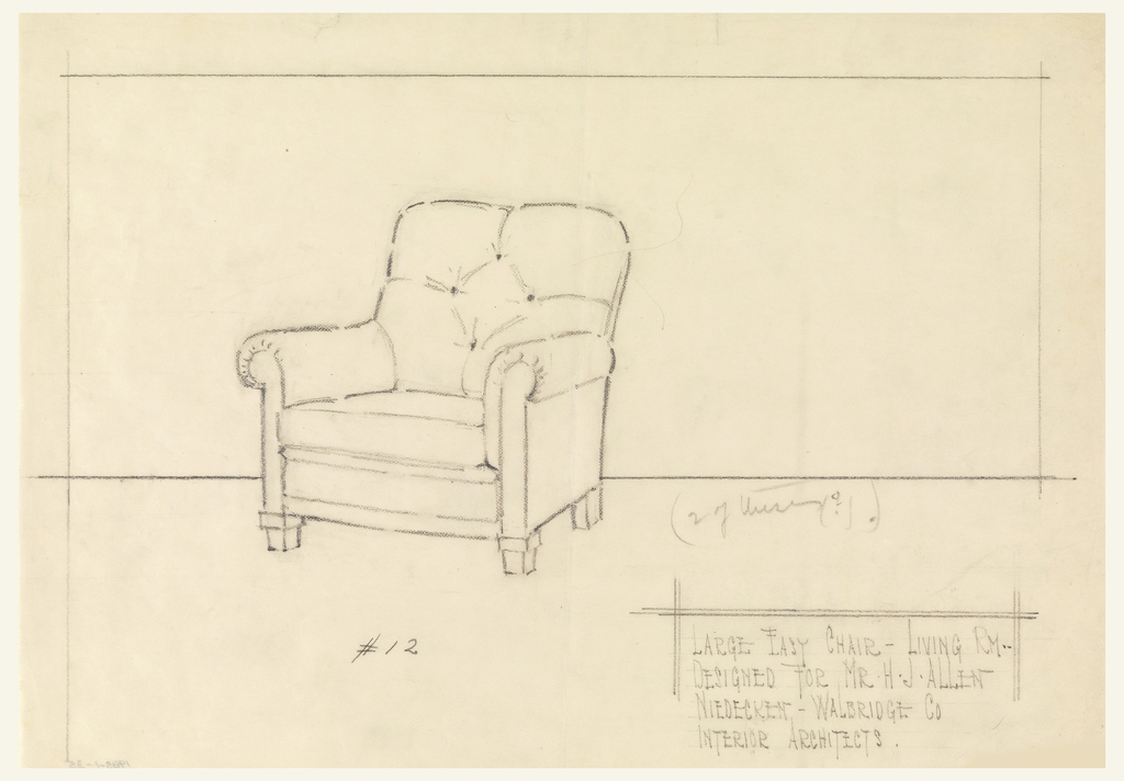 Inscribed in graphite, right: 2 of these (all underlined); lower right corner: Large Easy Chair - Living Rm./ Designed for Mr. H. J. Allen/ Niedecken-Walbrige Co./ Interior Architects (all underlined).