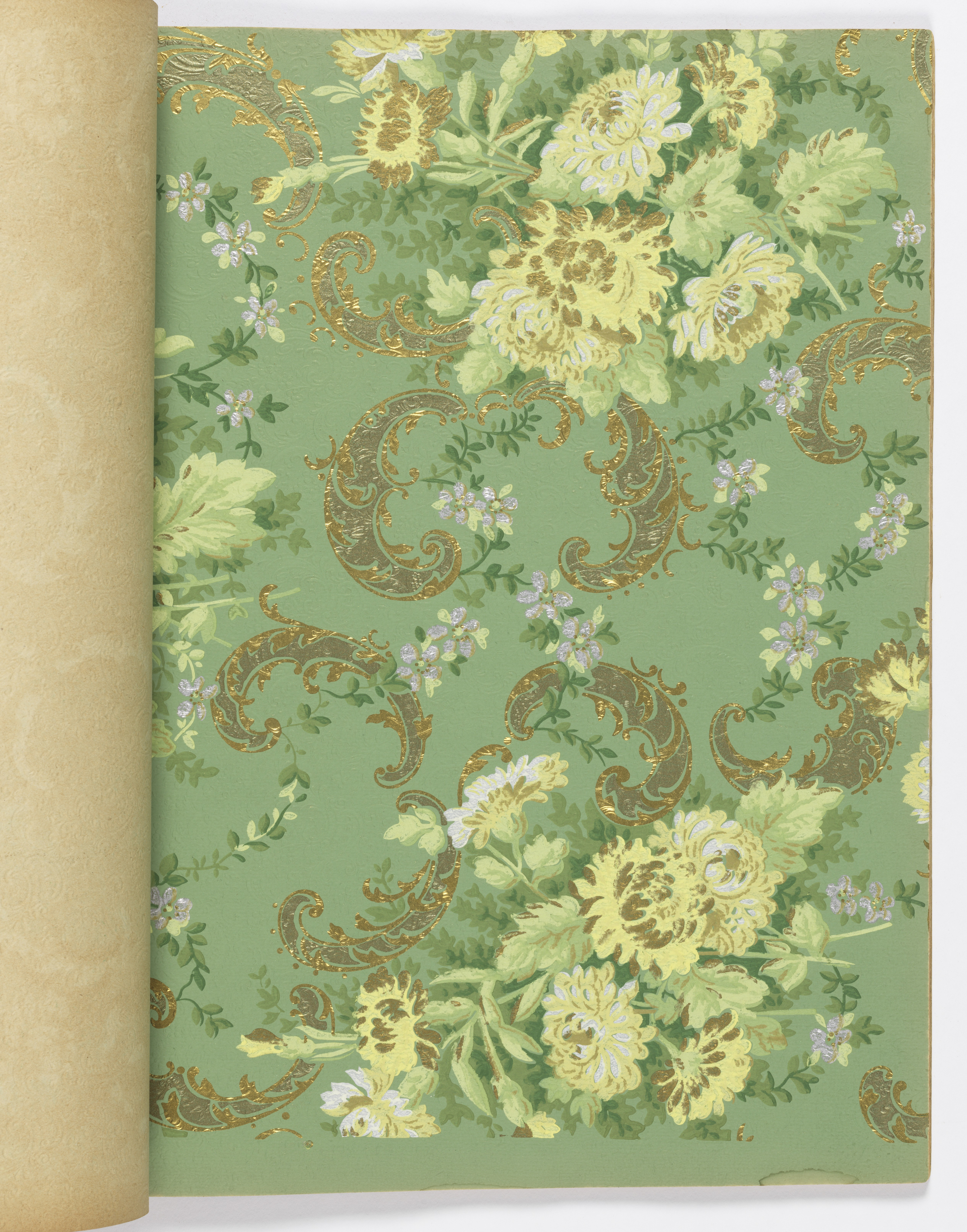 This is a Sample book. It was produced by Alfred Peats Company. It is dated 1906 and we acquired it in 1984. Its medium is machine-printed paper, liquid mica. It is a part of the Wallcoverings department.