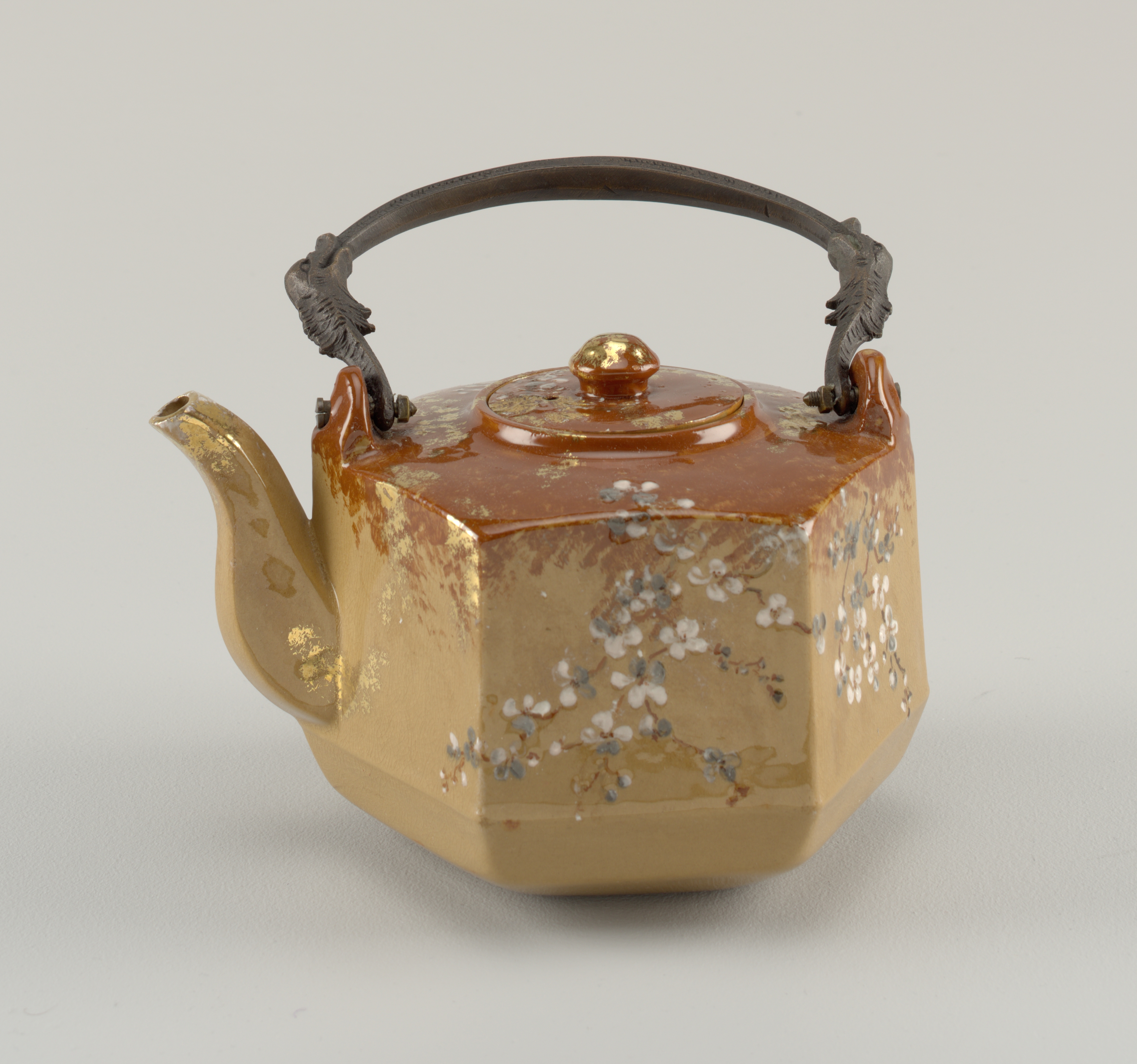Teapot Teapot; Manufactured by Rookwood Pottery (United States); Decorated by Clara Chipman Newton (American, 1848 – 1936); USA; earthenware, bronze; H x W x D (overall): 13.3 × 20 × 15.9 cm (5 1/4 × 7 7/8 × 6 1/4 in.) H x W x D (with handle upright): 22 cm (8 11/16 in.) H x diam. (lid): 3.2 × 6.7 cm (1 1/4 × 2 5/8 in.); Gift of Marcia and William Goodman; 1984-84-11-a,b