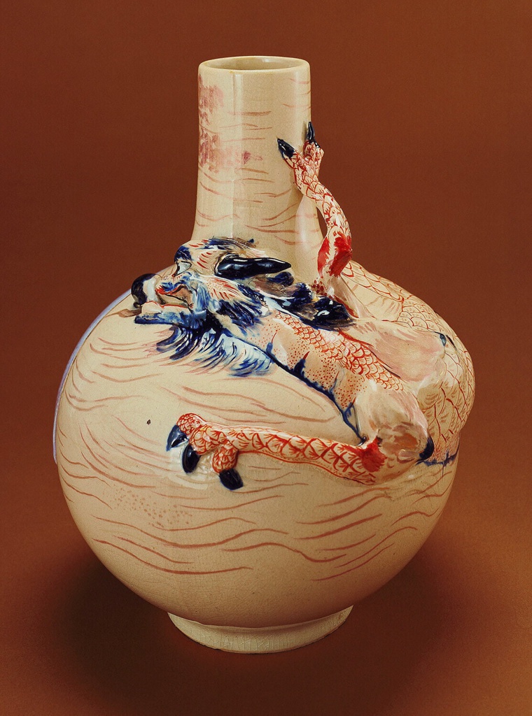 The dragon was one of Nichols’s favorite motifs. In Japanese culture dragons control the natural elements. Nichols’s treatment of birds and cattails on the vase’s body suggests their derivation from a Japanese print source, a number of which Nichols owned and had access to through their American circulation.