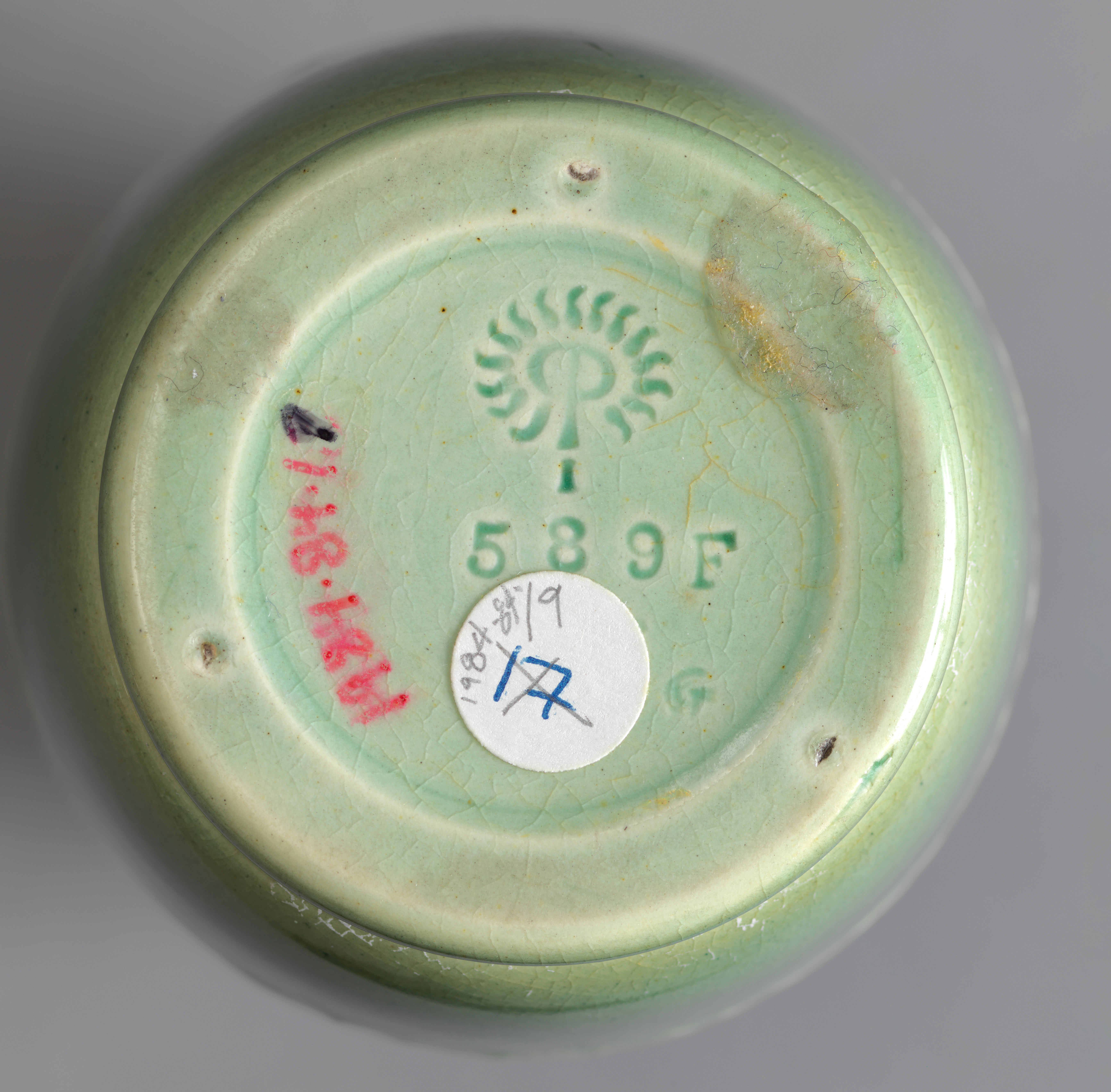 Impressed on bottom, underglaze: RP cipher with 14 flames, I beneath 589F Also underglaze on bottom: G. "G" indicates the glaze type: Sea-Green. Artist's monogram incised on bottom, underglaze: E.T.H.