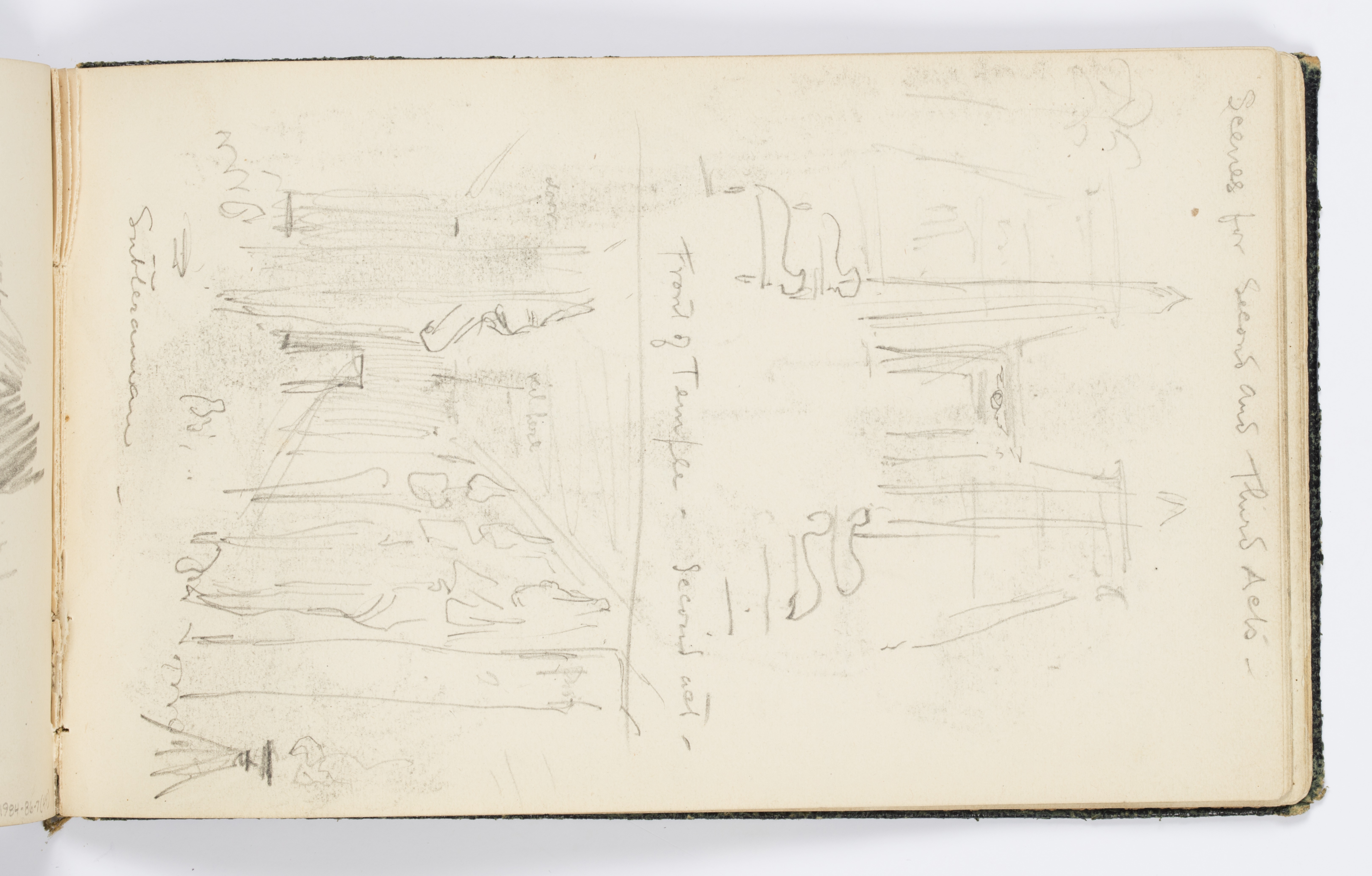 Recto: Inscribed in graphite, upper edge: Scenes for Second and Third Acts –; center: Front of Temple - Second Act –; notation in lower drawing, at left: door; notation in lower drawing, at center: veil here; lower left: Subteranian [sic] –