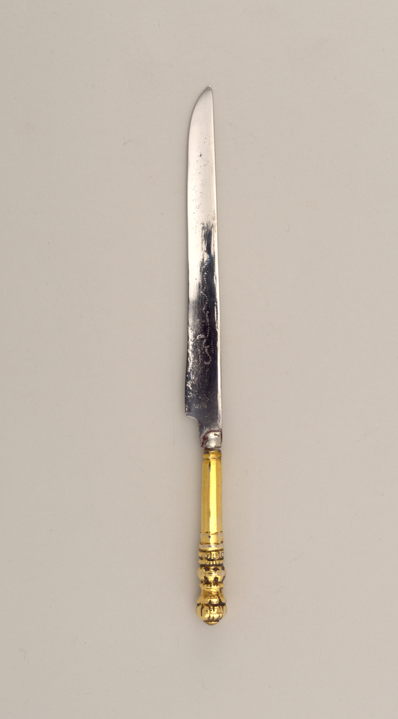 This is a knife. It is dated ca. 1700–1800 and we acquired it in 1985. Its medium is silver, leather, brass, steel. It is a part of the Product Design and Decorative Arts department.