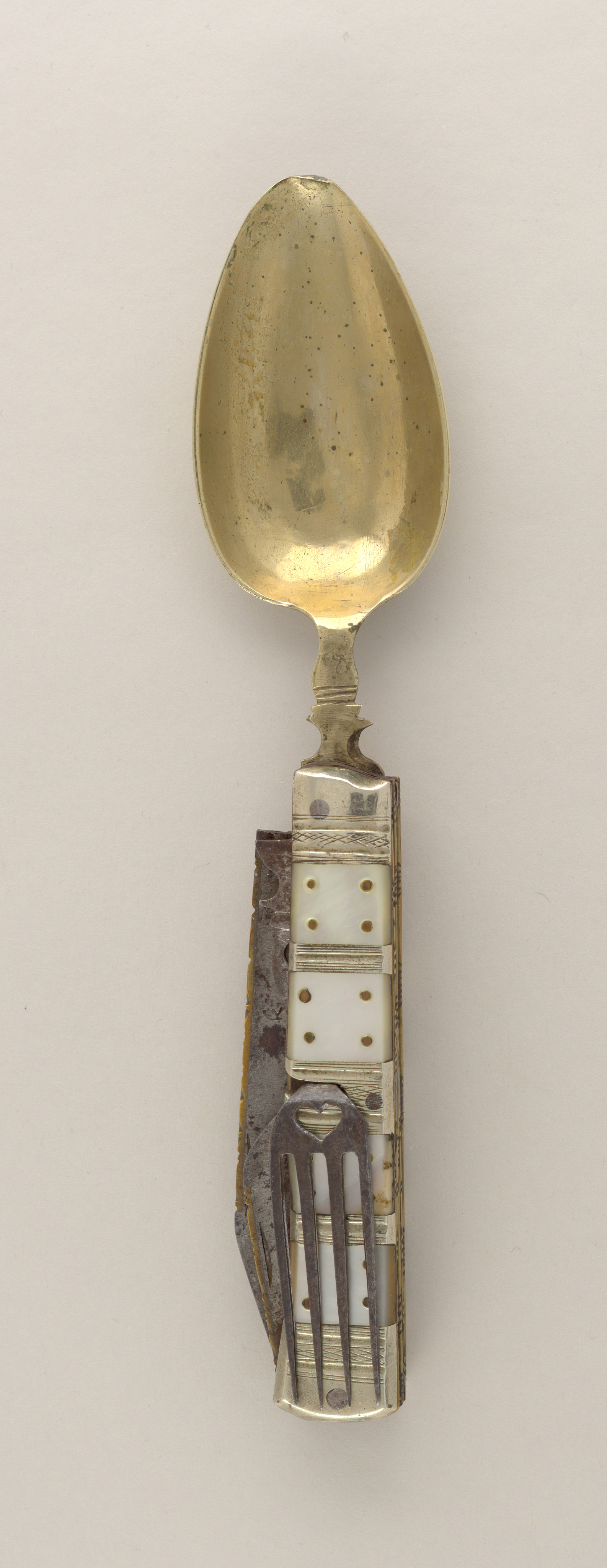 Folding Cutlery Set Folding Cutlery Set; Scandanavia or Germany; steel, brass, mother of pearl; L x W x D (folded): 12 × 4.6 × 3.7 cm (4 3/4 × 1 13/16 × 1 7/16 in.) L x W x D (opened): 21.9 × 4.6 × 2.5 cm (8 5/8 in. × 1 13/16 in. × 1 in.); The Robert L. Metzenberg Collection, gift of Eleanor L. Metzenberg; 1985-103-135