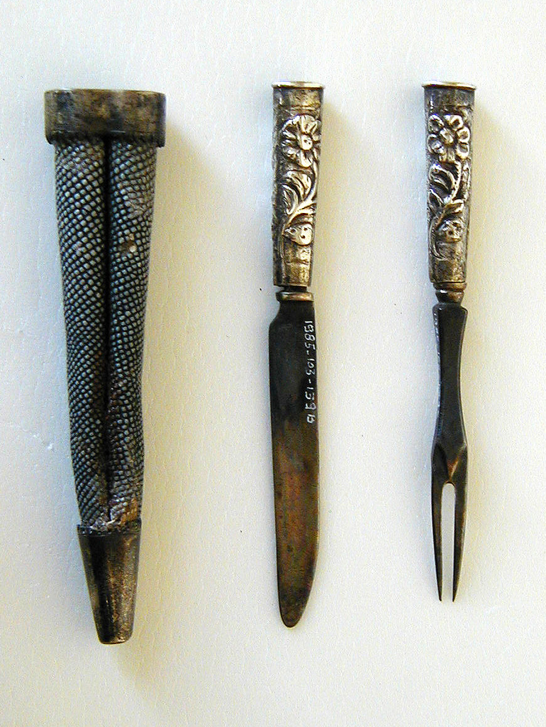 Early travel cases were originally just for knives, usually in pairs of different sizes, but began to invlude the fork as soon as it became generally acceptaed in each region. Such sets with cases are represented by examples in Cooper-Hewitt's collection from a variety of geographical locations, which include cases with various combinations of knives, forks, and/or spoons (figs. 45-48). Sometimes, the knives were carried separately, and folding forks and spoons, some of which used the same handle, traveled together ( fig. 49)