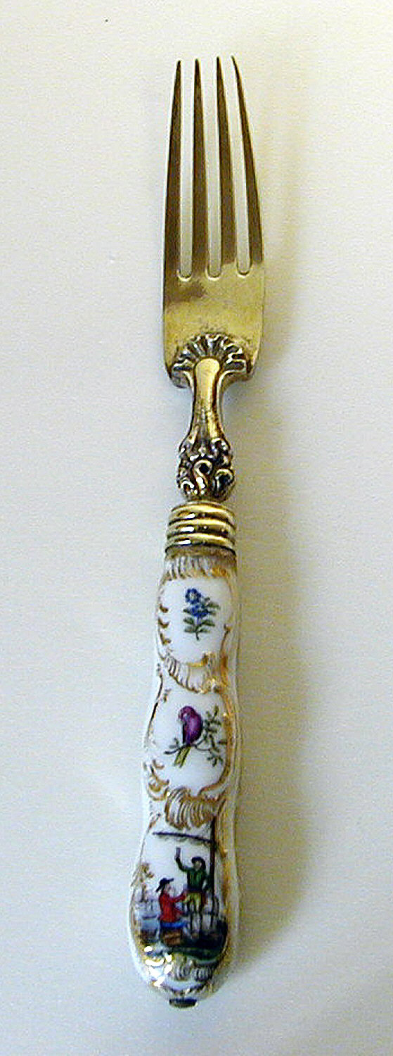 Fork with Porcelain Handle (with Knife and Spoon) Fork; Germany; porcelain, vitreous enamel, silver, gold; L x W x D: 20.6 × 2.4 × 2 cm (8 1/8 × 15/16 × 13/16 in.); The Robert L. Metzenberg Collection, gift of Eleanor L. Metzenberg; 1985-103-186